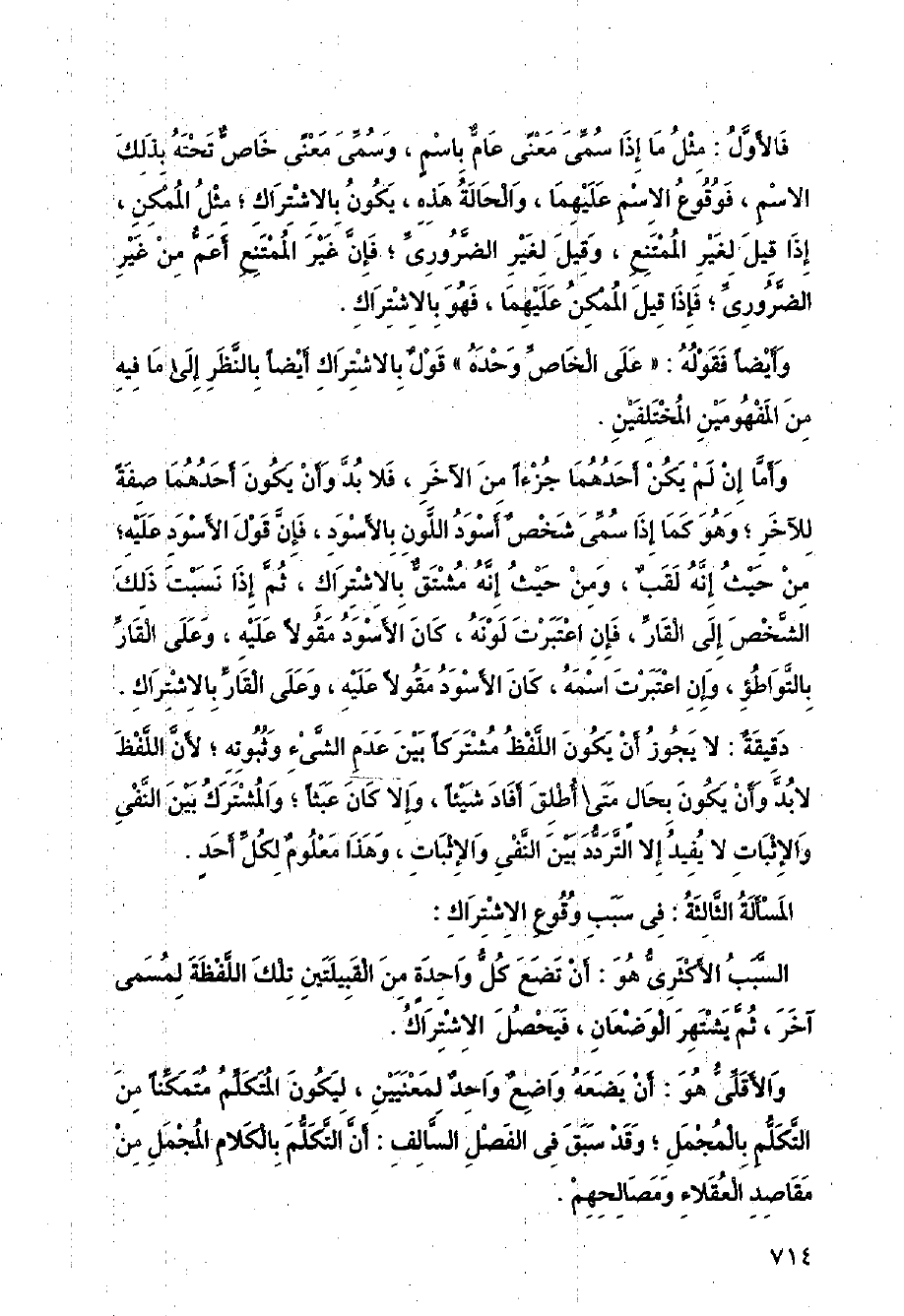 دقيقة: لا يجوز أن يكون اللفظ مشتركا بين عدم الشيء وثبوته؛ لأن اللفظ لابد وأن يكون بحال متى أطلق أفاد شيئا، وإلا كان عبثا؛ والمشترك بين النفي والإثبات لا يفيد إلا التردد بين النفي والإثبات، وهذا معلوم لكل أحد.