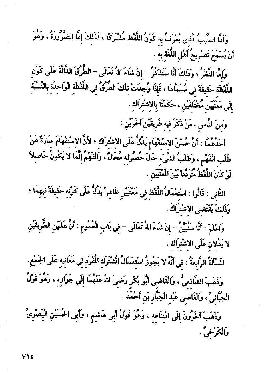 المسألة الرابعة: في أنه لا يجوز استعمال المشترك المفرد في معانيه على الجمع. وذهب الشافعي، والقاضي أبو بكر رضي الله عنهما إلى جوازه، وهو قول الجبائي، والقاضي عبد الجبار بن أحمد.