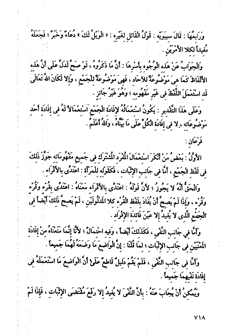 والجواب عن هذه الوجوه بأسرها: أن ما ذكروه، لو صح لدل على أن هذه الألفاظ كما هي موضوعة للآحاد، فهي موضوعة للجمع، وإلا كان الله تعالى قد استعمل اللفظ في غير مفهومه؛ وهو غير جائز.