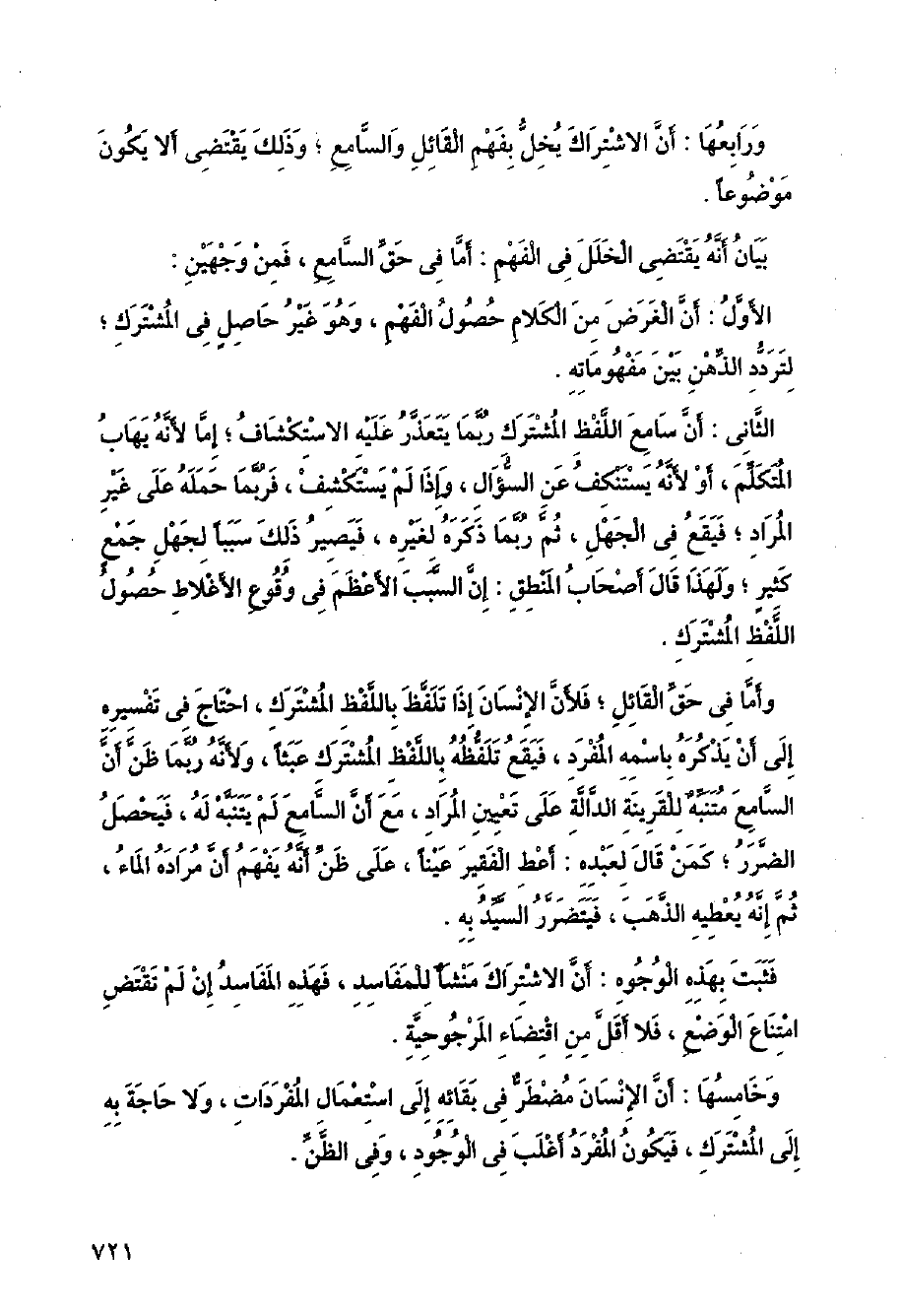 الثاني: أن سامع اللفظ المشترك ربما يتعذر عليه الاستكشاف؛ إما لأنه يهاب المتكلم، أو لأنه يستنكف عن السؤال، وإذا لم يستكشف، فربما حمله على غير المراد، فيقع في الجهل، ثم ربما ذكره لغيره، فيصير ذلك سببا لجهل جمع كثير؛ ولهذا قال أصحاب المنطق: إن السبب الأعظم في وقوع الأغلاط حصول اللفظ المشترك.