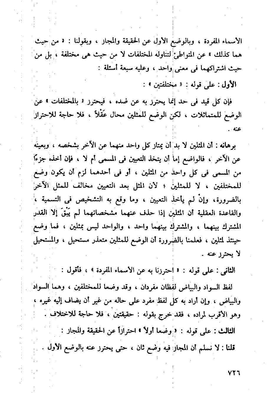 الأسماء المفردة، وبالوضع الأول عن الحقيقة والمجاز، وبقولنا: (من حيث هما كذلك) عن المتواطئ لتناوله المختلفات لا من حيث هي مختلفة، بل من حيث اشتراكهما في معنى واحد، وعليه سبعة أسئلة:
