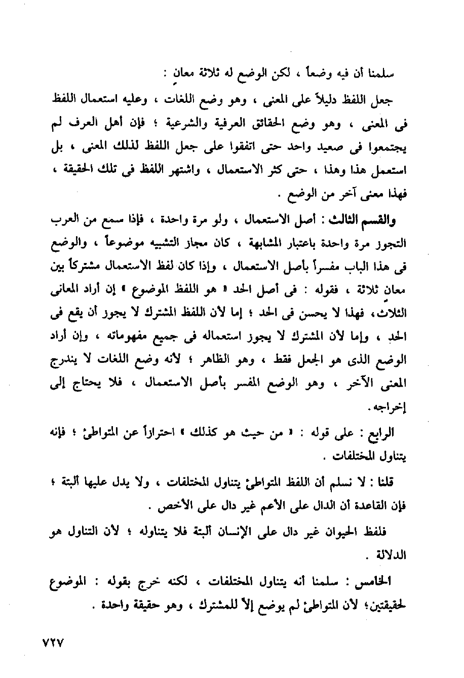 والقسم الثالث: أصل الاستعمال، ولو مرة واحدة، فإذا سمع من الغرب التجوز مرة واحدة باعتبار المشابهة، كان مجاز التشبيه موضوعا، والوضع في هذا الباب مفسرا بأصل الاستعمال، وإذا كان لفظ الاستعمال مشتركا بين معان ثلاثة، فقول: في أصل الحد (هو اللفظ الموضوع) إن أراد المعاني الثلاث، فهذا لا يحسن في الحد؛ إما لأن اللفظ المشترك لا يجوز أن يقع في الحد، وإما لأن المشترك لا يجوز استعماله في جميع مفهوماته، وإن أراد الوضع الذي هو الجعل فقط، وهو الظاهر؛ لأنه وضع اللغات لا يندرج المعنى الآخر، وهو الوضع المفسر بأصل الاستعمال، فلا يحتاج إلى إخراجه.