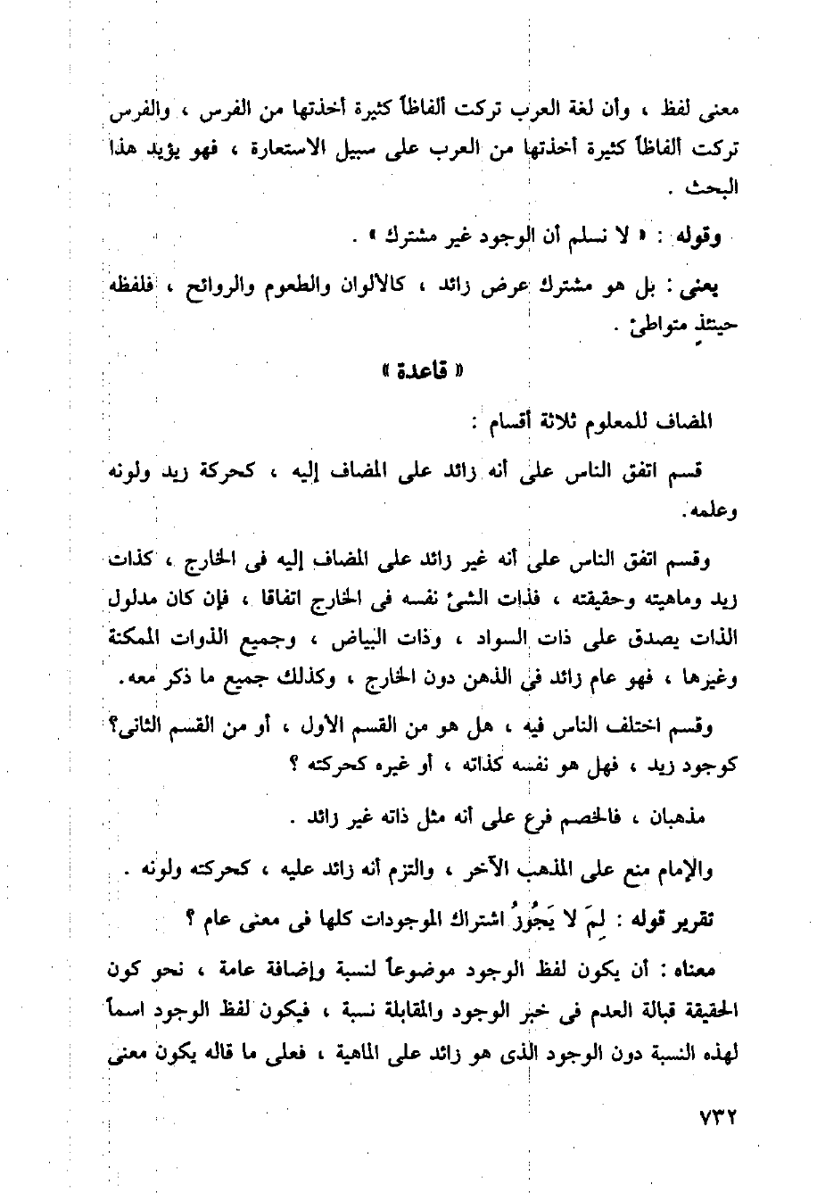 وقسم اتفق الناس على أنه غير زائد على المضاف إليه في الخارج، كذات زيد وماهيته وحقيقته، فذات الشيء نفسه في الخارج اتفاقا، فإن كان مدلول الذات يصدق على ذات السواد، وذات البياض، وجميع الذوات الممكنة وغيرها، فهو عام زائد في الذهن دون الخارج، وكذلك جميع ما ذكر معه.