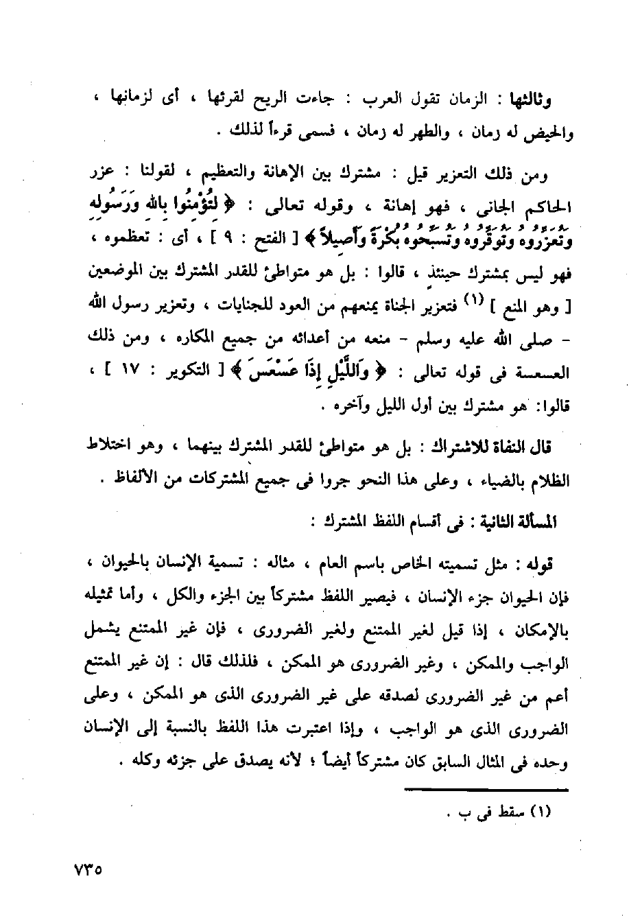 ومن ذلك التعزيز قيل: مشترك بين الإهانة والتعظيم، لقولنا: عزر الحاكم الجاني، فهو إهانة، وقوله تعالى:} لتؤمنوا بالله ورسوله وتعزروه وتوقروه وتسبحوه بكرة وأصيلا {(الفتح: 9)، أي: تعظموه، فهو ليس بمشترك حينئذ، قالوا: بل هو متواطئ للقدر المشترك بين الموضعين (وهو المنع) (1) فتعزيز الجناة يمنعهم من العود للجنايات، وتعزيز رسول الله صلى الله عليه وسلم منعه من أعدائه ن جميع المكاره، ومن ذلك العسعسة في قوله تعالى:} والليل إذا عسعس {(التكوير: 17)، قالوا: هو مشترك بين أول الليل وآخره.