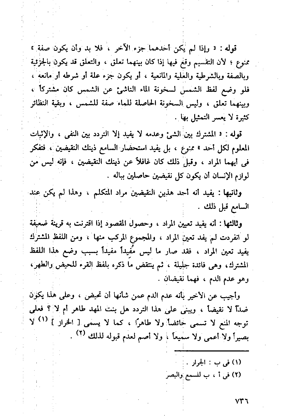 وثالثهما: أنه يفيد تعيين المراد، وحصول المقصود إذا اقترنت به قرينة ضعيفة لو انفردت لم يفد تعين المراد، والمجموع المركب منها، ومن اللفظ المشترك يفيد تعين المراد، فقد صار ما ليس مفيدا بسبب وضع هذا اللفظ المشترك، وهي فائدة جليلة، ثم ينتقض ما ذكره بلفظ القرء للحيض والطهر، وهو عدم الدم، فهما نقيضان.