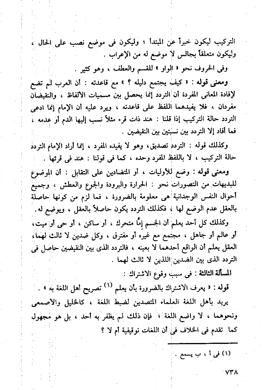 ومعنى قوله: (كيف يجتمع دليله؟) مع قاعدته: أن العرب لم تضع لإفادة المعاني المفردة أن التردد إنما يحصل بين مسميات الألفاظ، والنقيضان مفردان، فلا يفيدهما اللفظ على قاعدته، ويرد عليه أن الإمام إنما ادعى التردد حالة التركيب إذا قلنا: هند ذات قرء مثلا نسب إليها الدم أو عدمه، فما أفاد إلا التردد بين نسبتين بين النقيضين.