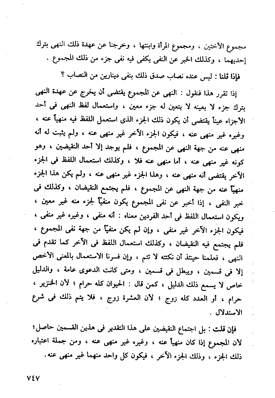 مجموع الأختين، ومجموع المرأة وبنتها، وخرجنا عن عهدة ذلك النهي بترك إحديهما، وكذلك الخبر عن النفي يكفي فيه نفي جزء من ذلك المجموع.