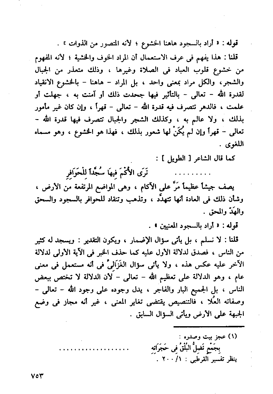 قلنا: لا تسلم، بل يأتي سؤال الإضمار، ويكون التقدير: ويسجد له كثير من الناس، فصدق لدلالة الأول عليه كما حذف الخبر في الآية الأولى لدلالة الآخر عليه عكس هذه، ولا يأتي سؤال الغزالي في أنه مستعمل في معنى عام، وهو الدلالة على تعظيم الله تعالى لأن الدلالة لا تختص ببعض الناس، بل الجميع البار والفاجر، يدل وجوده على وجود الله تعالى وصفاته العلا، فالتنصيص يقتضي تغاير المعنى، غير أنه مجاز في وضع الجبهة على الأرض ويأتي السؤال السابق.