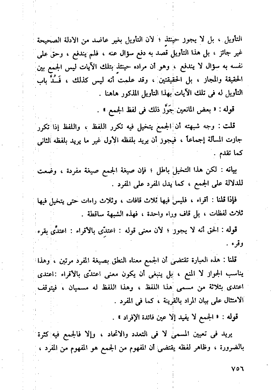 قلنا: هذه العبارة تقتضي أن الجمع معناه النطق بصيغة المفرد مرتين، وهذا يناسب الجواز لا المن، بل ينبغي أن يكون معنى اعتدى بالأقراء: اعتدى بثلاثة من مسمى هذا اللفظ، وهذا اللفظ له مسميان، فيتوقف الامتثال على بيان المراد بالقرينة، كما في المفرد.
