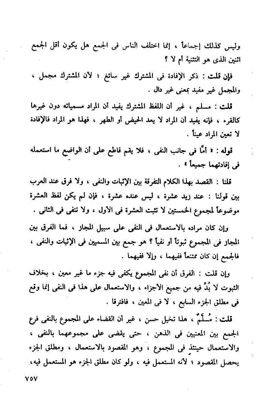 قلنا: القصد بهذا الكلام التفرقة بين الإثبات والنفي، ولا فرق عند العرب بين قولنا: عند زيد عشرة، ليس عنده عشرة، فإن لم يكن لفظ العشرة موضوعا لمجموع الخمستين لا تثبت العشرة في الأول، ولا تنفي في الثاني.