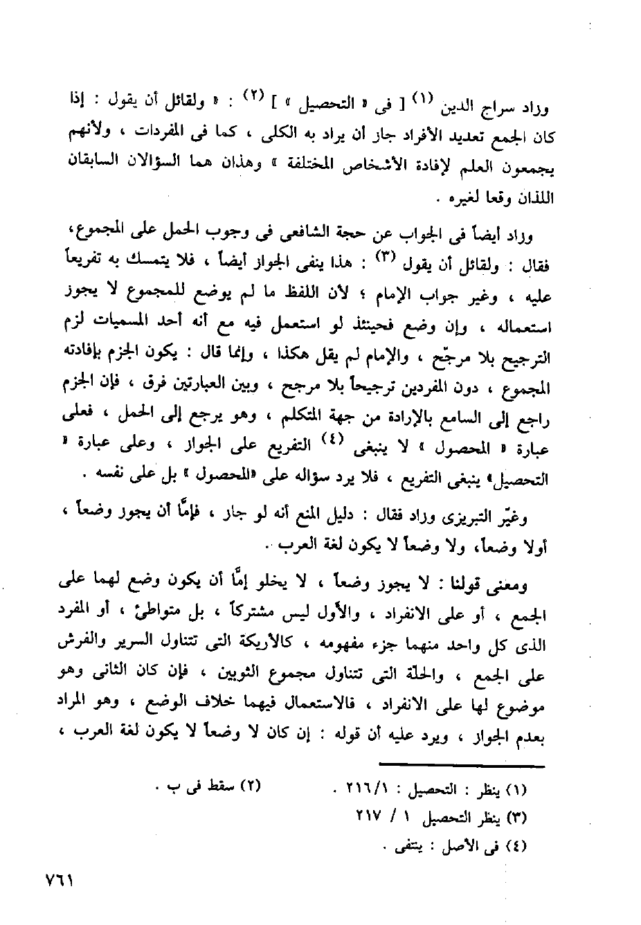 وزاد سراج الدين] في (التحصيل) [: "ولقائل أن يقول: (إذا كان الجمع تعديد الأفراد جاز أن يراد به الكلى، كما في المفردات، ولأنهم يجمعون العلم لإفادة الأشخاص المختلفة) وهذان هما السؤالان السابقان اللذان وقعا لغيره.
