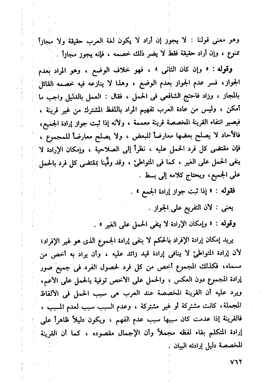وقوله: (وإن كان الثاني)، فهو خلاف الوضع، وهو المراد بعدم الجواز، فسر عدم الجواز بعدم الوضع، وهذا لا ينازعه فيه خصمه القائل بالمجاز، وزاد فاحتج الشافعي في الحمل، فقال: العمل بالدليل واجب ما أمكن، وليس من عادة العرب تفهيم المراد باللفظ المشترك من غير قرينة، فيصير انتفاء القرينة المخصصة قرينة معممة، ولأنه إذا ثبت جواز إرادة الجميع، فالآحاد لا يصلح بعضها معارضا للبعض، ولا يصلح معارضا للمجموع، فإن مقتضى كل فرد الحمل عليه، نظرا إلى الصلاحية، وإمكان الإرادة لا ينفي الحمل على الغير، كما في المتواطئ، وقد وفًّينا بمقتضى كل فرد بالحمل على الجميع، ويحتاج كلامه إلى بسط.