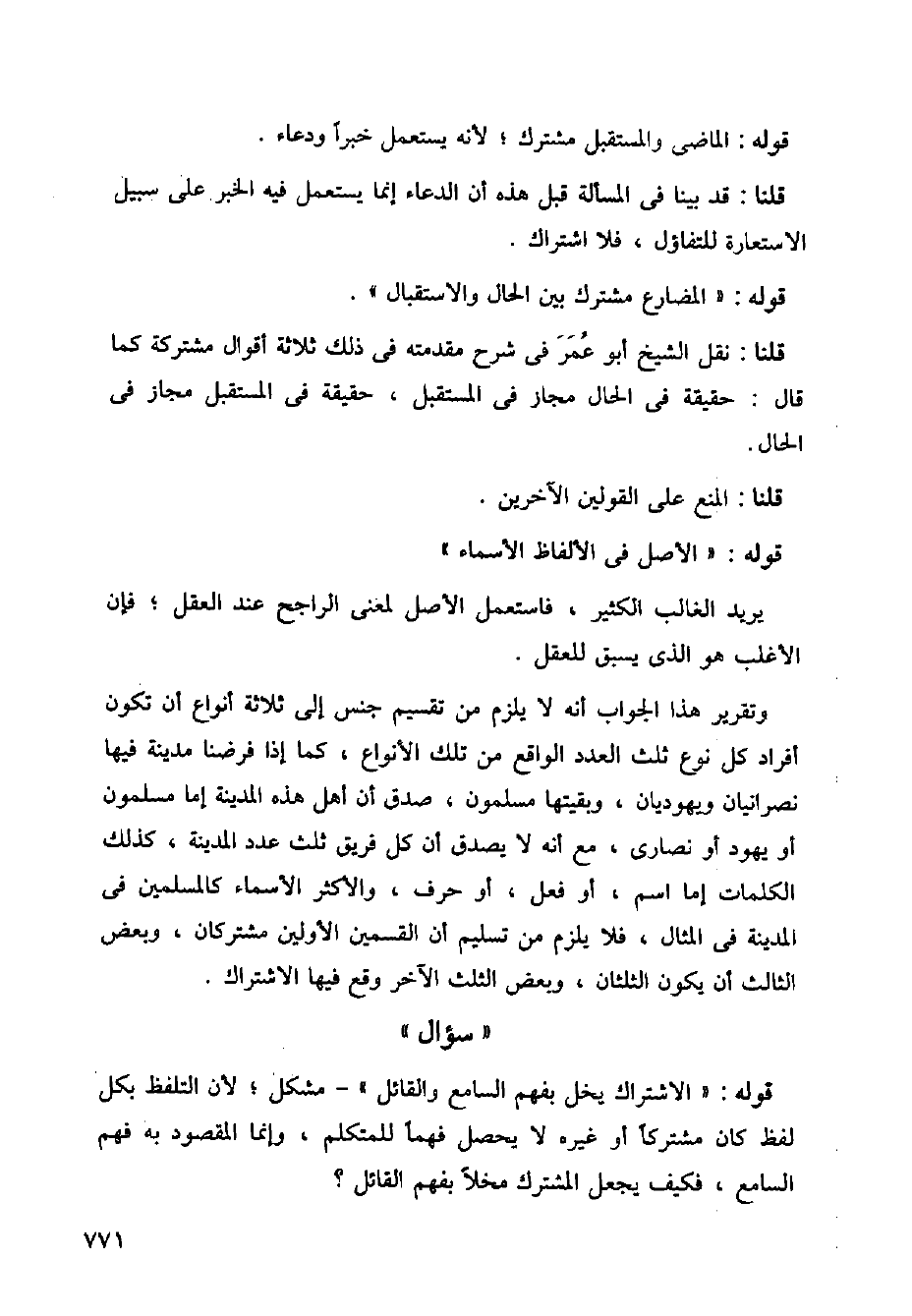وتقرير هذا الجواب أنه لا يلزم من تقسيم جنس إلى ثلاثة أنواع أن تكون أفراد كل نوع ثلث العدد الواقع من تلك الأنواع، كما إذا فرضنا مدينة فيها نصرانيان ويهوديان، وبقيتها مسلمون، صدق أن أهل هذه المدينة إما مسلمون أو يهود أو نصارى، مع أنه لا يصدق أن كل فريق ثلث عدد المدينة، كذلك الكلمات إما اسم، أو فعل، أو حرف، والأكثر الأسماء كالمسلمين في المدينة في المثال، فلا يلزم من تسليم أن القسمين الأولين مشتركان، وبعض الثالث في المثال، فلا يلزم من تسليم أن القسمين الأولين مشتركان، وبعض الثالث أن يكون الثلثان، وبعض الثلث الآخر وقع فيها الاشتراك.