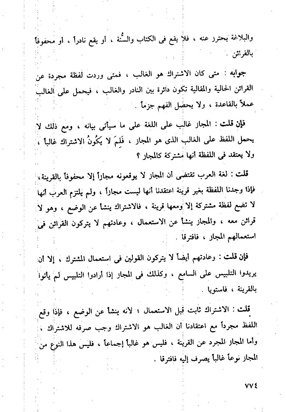 فإن قلت: وعادتهم أيضا لا يتركون القولين في استعمال المشترك، إلا أن يريدوا التلبيس على السامع، وكذلك في المجاز إذا أرادوا التلبيس لم يأتوا بالقرينة، فاستويا.