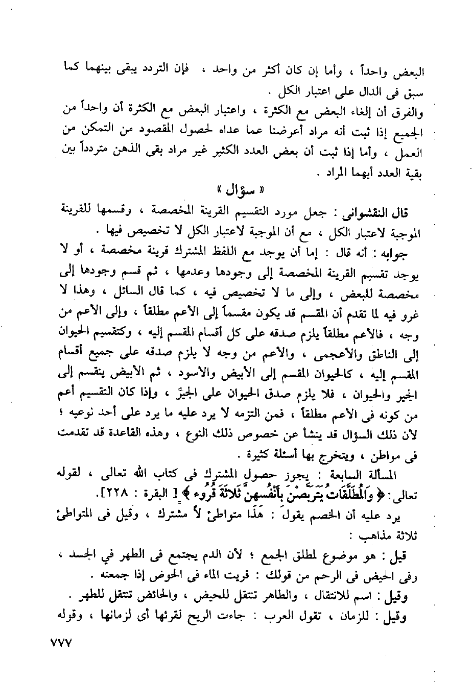 جوابه: أنه قال: إما أن يوجد مع اللفظ المشترك قرينة مخصصة، أو لا يوجد تقسيم القرينة المخصصة إلى وجودها وعدمها، ثم قسم وجودها إلى مخصصة للبعض، وإلى ما لا تخصيص فيه، كما قال السائل، وهذا لا غرو فيه لما تقدم أن المقسم قد يكون مقسما إلى الأعم مطلقا، وإلى الأعم من وجه، فالأعم مطلقا يلزم صدقه على كل أقسام المقسم إليه، وكتقسيم الحيوان إلى الناطق والأعجمي، والأعم من وجه لا يلزم صدقه على جميع أقسام المقسم إليه، كالحيوان المقسم إلى الأبيض والأسود، ثم الأبيض ينقسم إلى الجير والحيوان، فلا يلزم صدق الحيوان على الجبر، وإذا كان التقسيم أعم من كونه في الأعم مطلقا، فمن التزمه لا يرد عليه ما يرد على أحد نوعيه؛ لأن ذلك السؤال قد ينشأ عن خصوص ذلك النوع، وهذه القاعدة قد تقدمت في مواطن، ويتخرج بها أسئلة كثيرة.