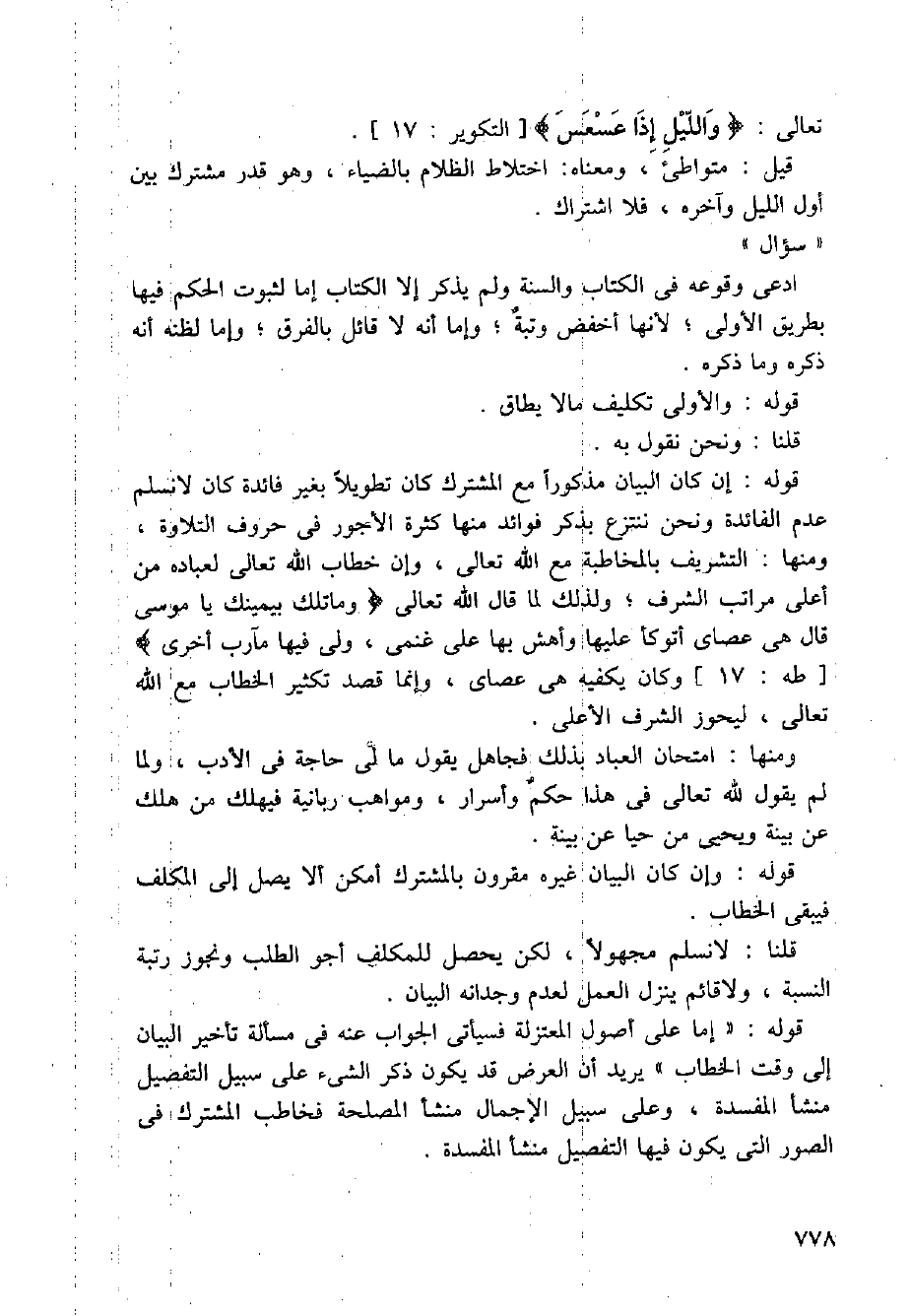 قوله: إن كان البيان مذكورا مع المشترك كان تطويلا بغير فائدة كان لا نسلم عدم الفائدة ونحن ننتزع بذكر فوائد منها كثرة الأجور في حروف التلاوة، ومنها: التشريف بالمخاطبة مع الله تعالى، وإن خطاب الله تعالى لعباده من أعلى مراتب الشرف؛ وذلك لما قاله الله تعالى {وما تلك بيمينك يا موسى قال هي عصاي أتوكأ عليها وأهش بها على غنمي، ولي فيها مآرب أخرى}] طه: 17 [وكان يكفيه هي عصاي، وإنما قصد تكثير الخطاب مع الله تعالى، ليحوز الشرف الأعلى.