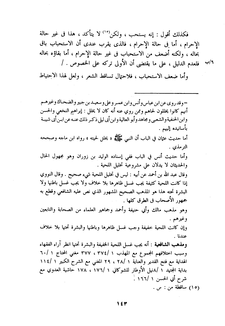 فكذلك أقول: إنه يستحب، ولكن لا يتأكد، فهذا في غير حالة الإحرام، أما في حالة الإحرام، فالذي يقرب عندي أن الاستحباب باق بحاله، ولكنه أضعف من الاستحباب في غير حالة الإحرام، أما بقاؤه بحاله فلعدم الدليل، على ما يقتضي أن الأولى تركه على الخصوص.