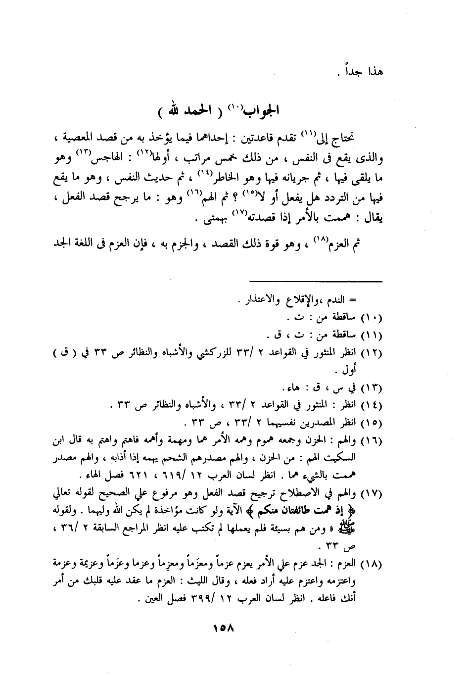 نحتاج إلى تقدم قاعدتين: إحداهما فيما يؤخ به من قصد المعصية، والذي يقع في النفس، من ذلك خمس مراتب، أولها: الهاجس وهو ما يلقى فيها، ثم جريانه فيها وهو الخاطر، ثم حديث النفس، وهو ما يقع فيها من التردد هل يفعل أو لا؟ ثم الهم وهو: ما يرجح قصد الفعل، يقال: هممت بالأمر إذا قصدته بهمتي.