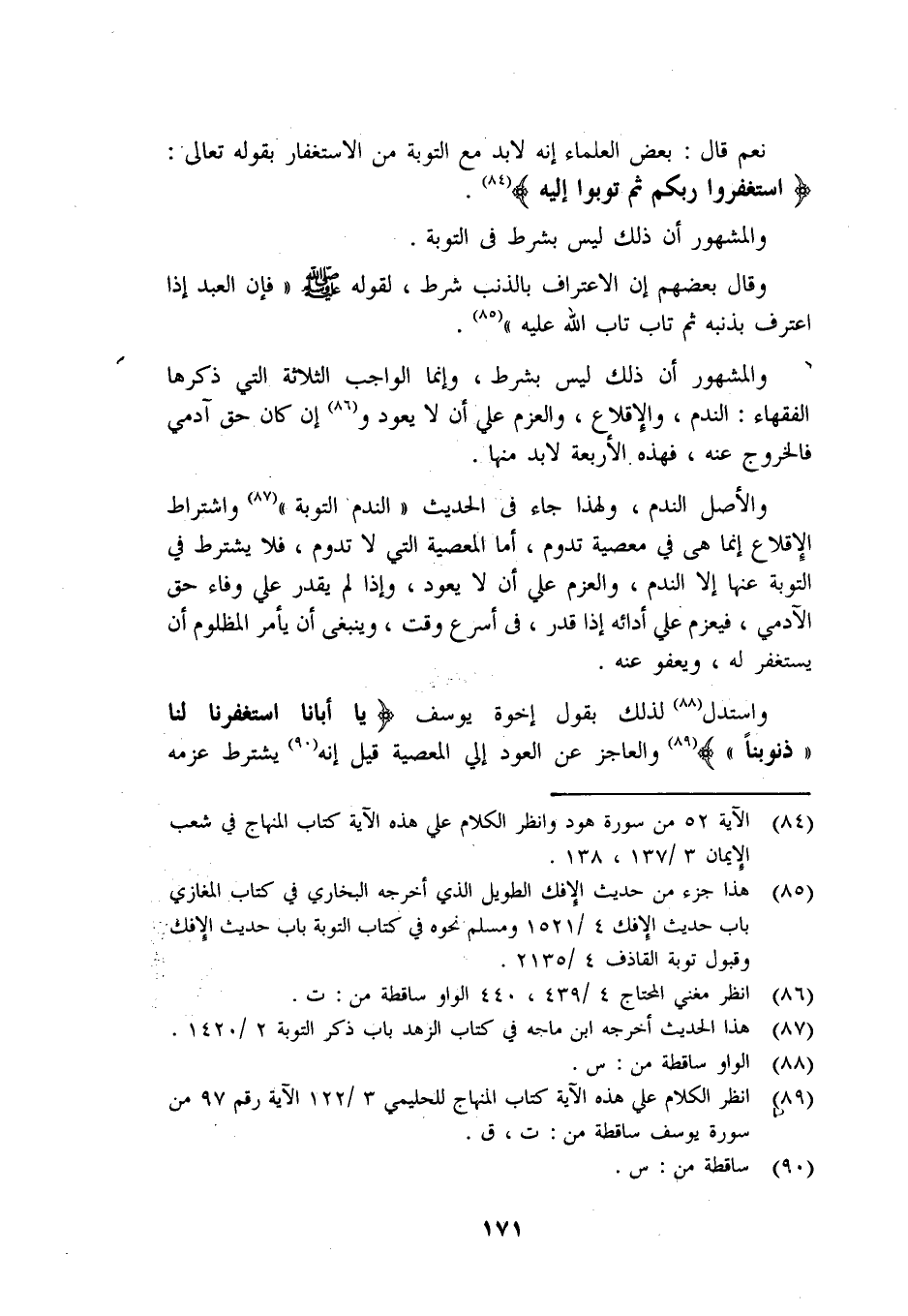 وقال بعضهم إن الاعتراف بالذنب شرط، لقوله صلى الله عليه وسلم ((فإن العبد إذا اعترف بذنبه ثم تاب تاب الله عليه)).