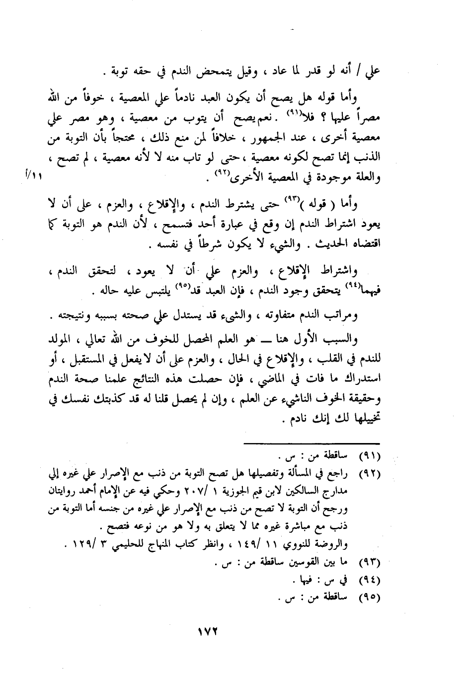 واشتراط الإقلاع، والعدم على أن لا يعود، لتحقق الندم، فيهما يتحقق وجود الندم، فإن العبد قد يلتبس عليه حاله.
