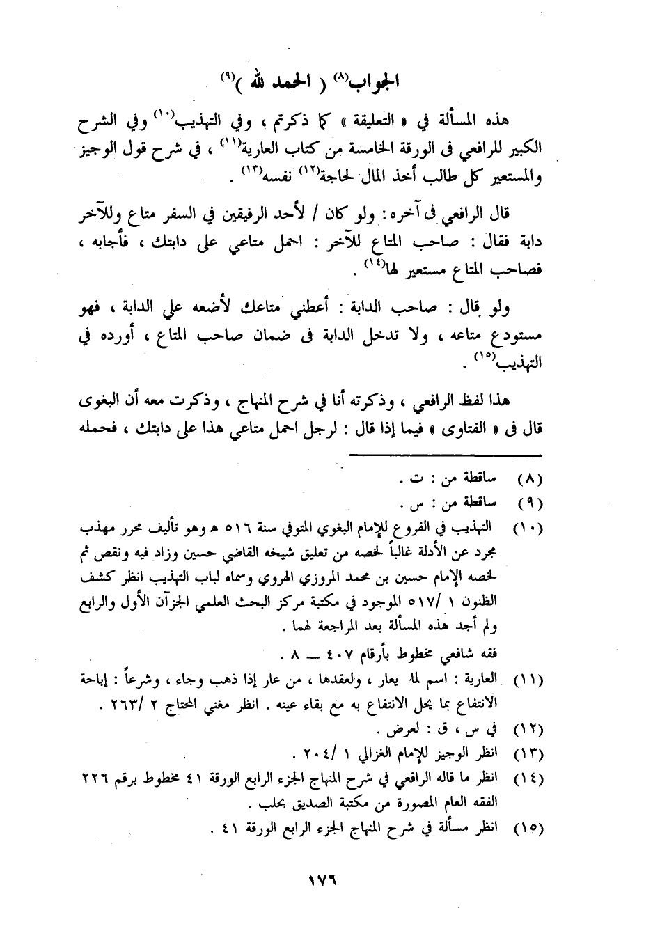 هذه المسألة في (التعليقة) كما ذكرتم، وفي التهذيب وفي الشرح الكبير للرافعي في الورقة الخامسة من كتاب العارية، في شرح قول الوجيز والمستعير كل طالب أخذ المال لحاجة نفسه.