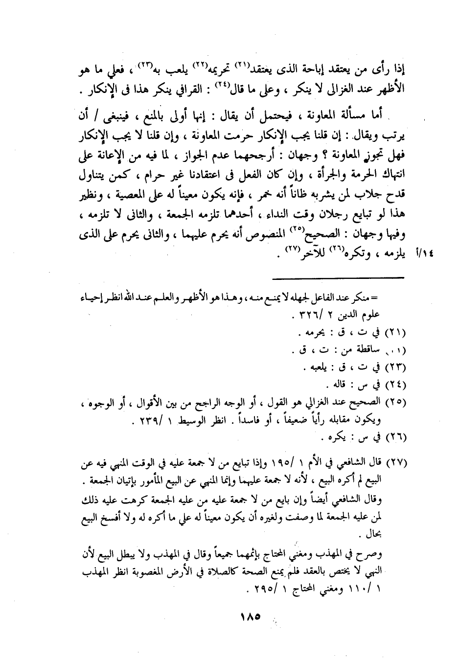 أما مسألة المعاونة، فيحتمل أن يقال: أنها أولى بالمنع، فينبغي / أن يرتب ويقال: إن قلنا يجب الإنكار فهل تجوز المعاونة؟ وجهان: أرجحهما عدم الجواز، لما فيه من الإعانة على انتهاك الحرمة والجرأة، وإن كان الفعل غير حرام، كمن يتناول قدح جلاب لمن يشربه ظانا أن خمر، فإنه يكون معينا له على المعصية، ونظبر هذا لو تبايع رجلان وقت النداء، أحدهما تلزمه الجمعة، والثاني لا تلزمه، وفيها وجهان: الصحيح المنصوص أنه يحرم عليهما، والثاني يحرم على الذي يلزمه، وتكره للآخر.