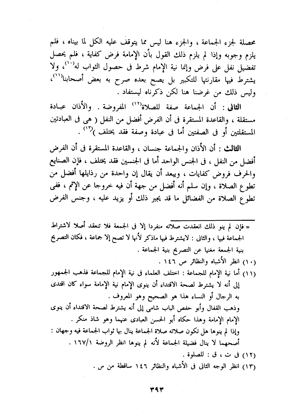 محصلة لجزء الجماعة، والجزء هنا ليس مما يتوقف عليه الكل لما بيناه، فلم يلزم وجوبه وإذا لم يلزم ذلك القول بأن الإمامة فرض كفاية، فلم يحصل تفضيل نفل على فرض وإنما نية الإمام شرط في حصول الثواب له، ولا يشترط فليها مقارنتها للتكبير بل يصح بعده صرح به بعض أصحابنا، وليس ذلك من غرضنا هنا لكن ذكرناه ليستفاد.