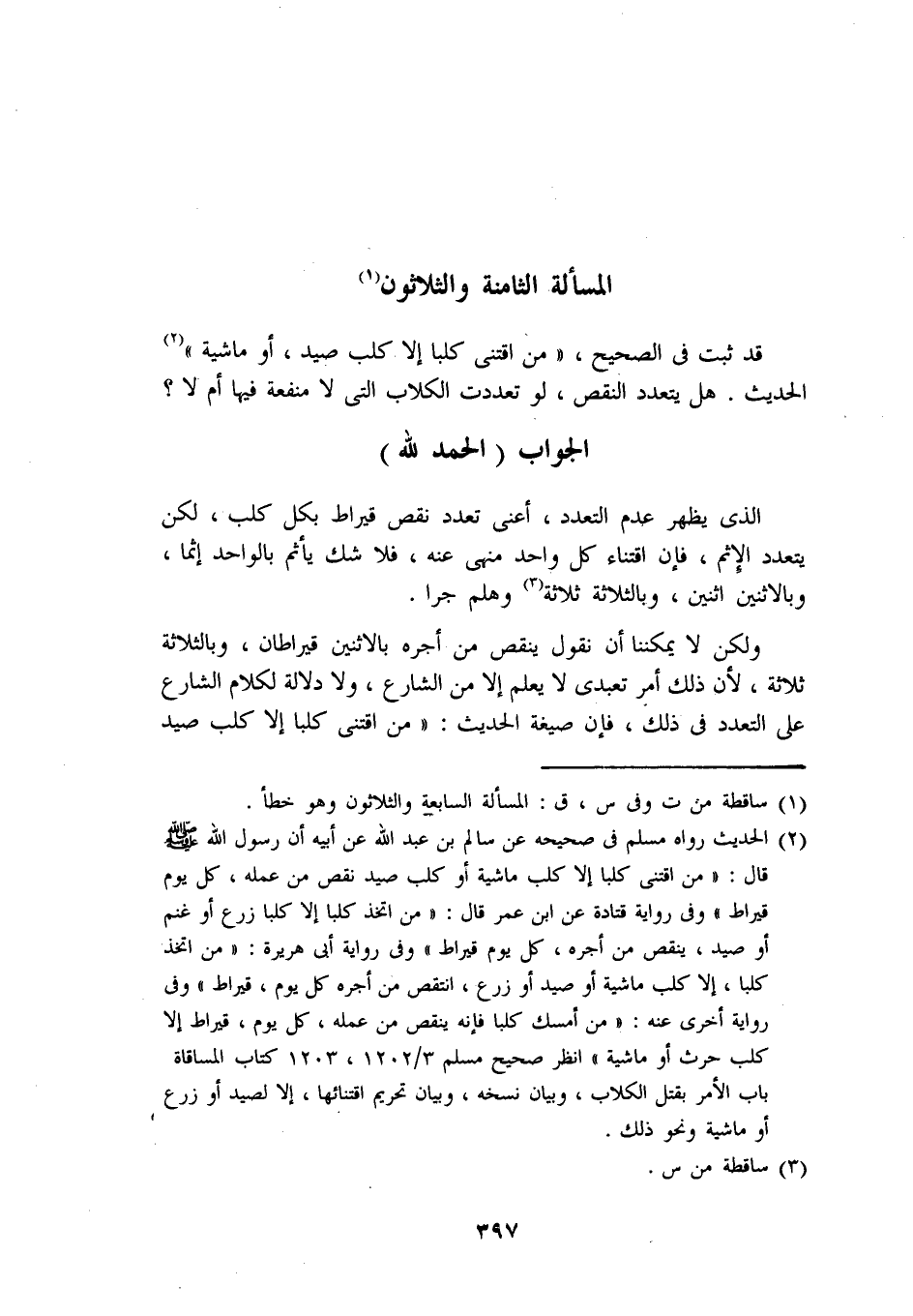 قد ثبت في الصحيح، "من اقتنى كلبا إلا كلب صيد، أو ماشية" الحديث. هل يتعدد النقص، لو تعددت الكلاب التي لا منفعة فيها أم لا؟