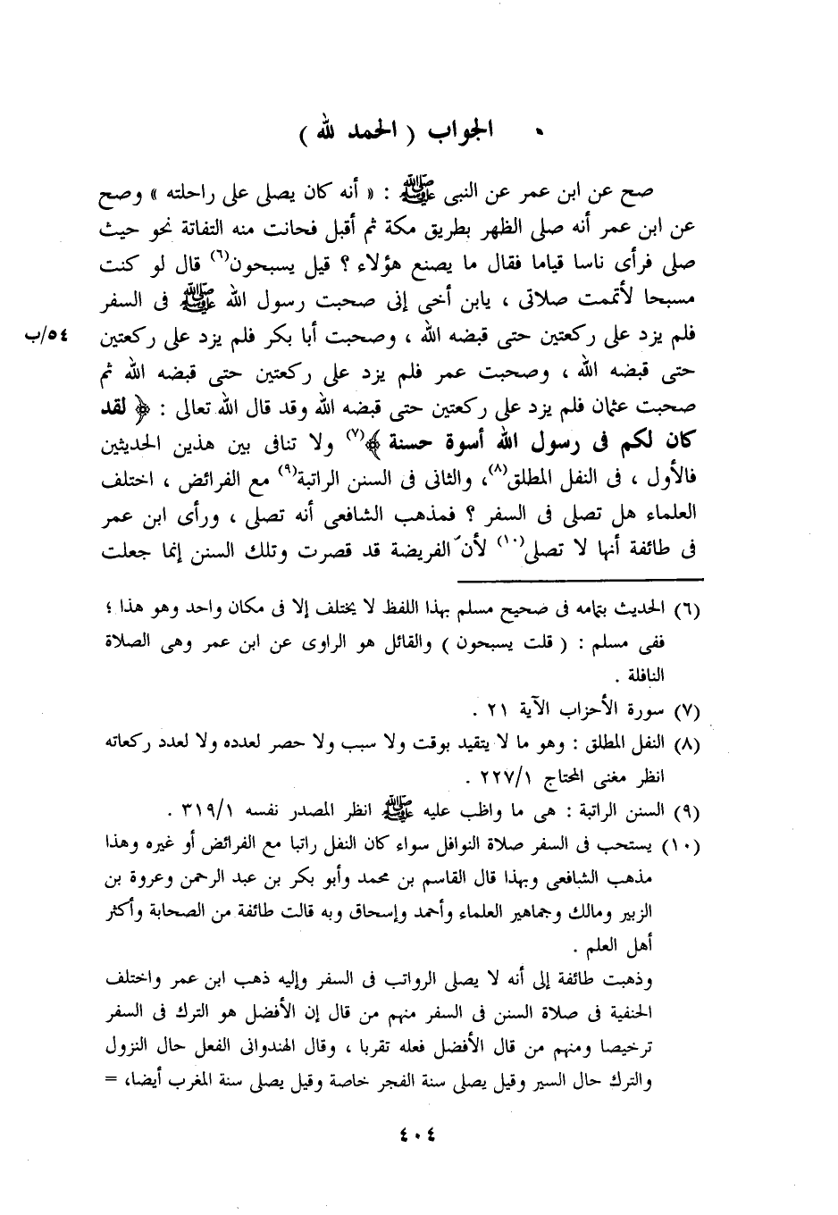 صح عن ابن عمر عن النبي صلى الله عليه وسلم: "أنه كان يصلي على راحلته" وصح عن ابن عمر أنه صلى الظهر بطريق مكة ثم أقبل فحانت منه التفاته نحو حيث صلى فرأى ناسا قياما فقال ما يصنع هؤلاء؟ قيل يسبحون قال لو كنت مسبحا لأتممت صلاتي، يا بن أخي إني صحبت رسول الله صلى الله عليه وسلم في السفر فلم يزد على ركعتين حتى قبضه الله، وصحبت أبا بكر فلم يزد على ركعتين حتى قبضه الله، وصحبت عمر فلم يزد على ركعتين حتى قبضه الله ثم صحبت عثمان فلم يزد على ركعتين حتى قبضه الله وقد قال الله تعالى: (لقد كان لكم في رسول الله أسوة حسنة) ولا تنافى بين هذين الحديثين فالأول، في النفل المطلق، والثاني في السنن الراتبة مع الفرائض، اختلف العلماء هل تصلي في السفر؟ فمذهب الشافعي أن تصلي، ورأى ابن عمر في طائفة أنها لا تصلي لأن الفريضة قد قصرت وتلك السنن إنما جعلت