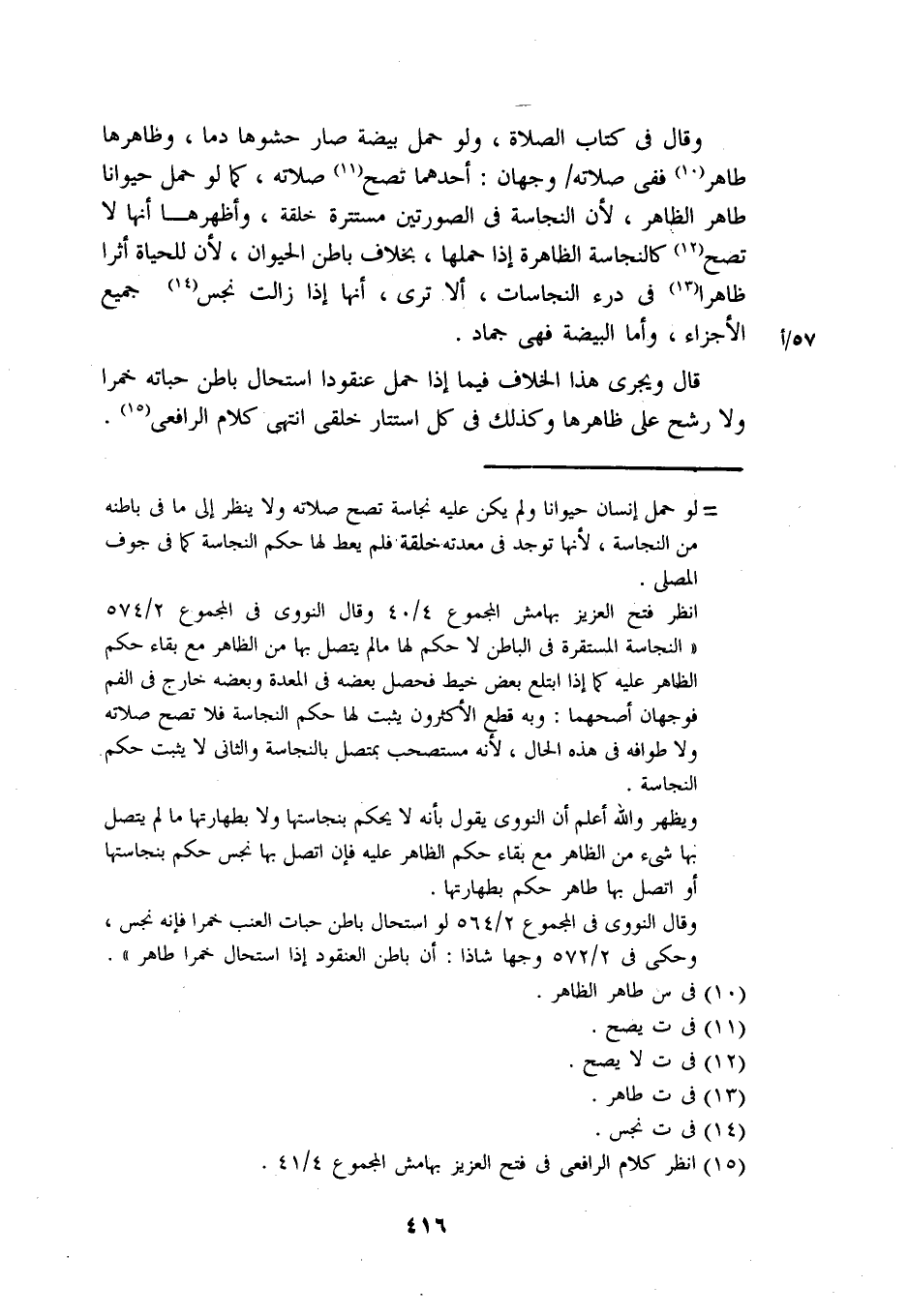 وقال في كتاب الصلاة، ولو حمل بيضة صار حشوها دما، وظاهرها طاهر ففي صلاته/ وجهان: أحدهما تصح صلاته، كما لو حمل حيوانا طاهر الظاهر، لأن النجاسة في الصورتين مستترة خلقة، وأظهرها أنها لا تصح كالنجاسة الظاهرة إذا حملها، بخلاف باطن الحيوان، لأن للحياة أثرا ظاهرًا في درء النجاسات، ألا ترى، أنها إذا زالت نجس جميع الأجزاء، وأما البيضة فهي جماد.