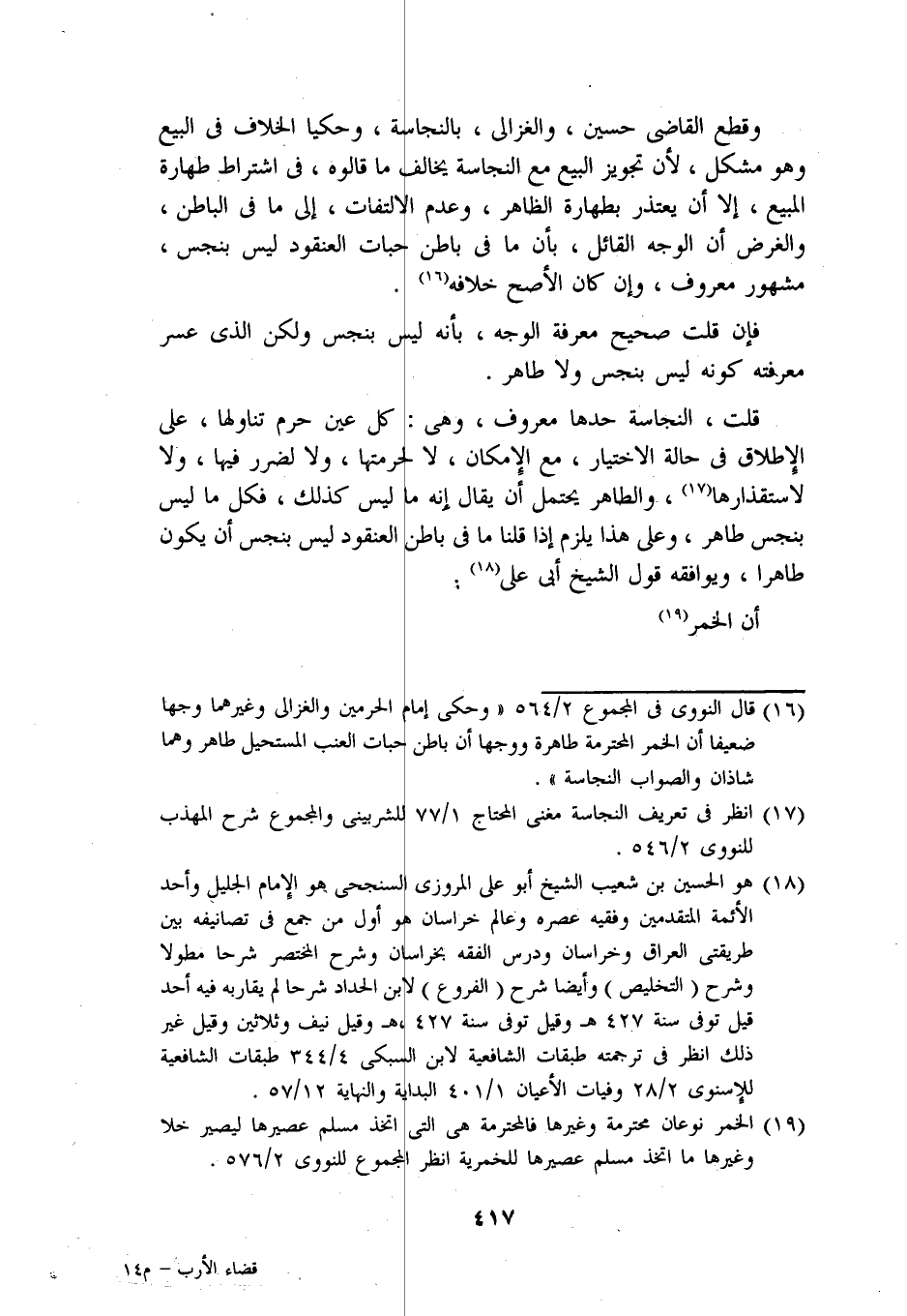 فإن قلت صحيح معرفة الوجه، بأنه ليس بنجس ولكن الذي عسر معرفته كونه ليس بنجس ولا طاهر.