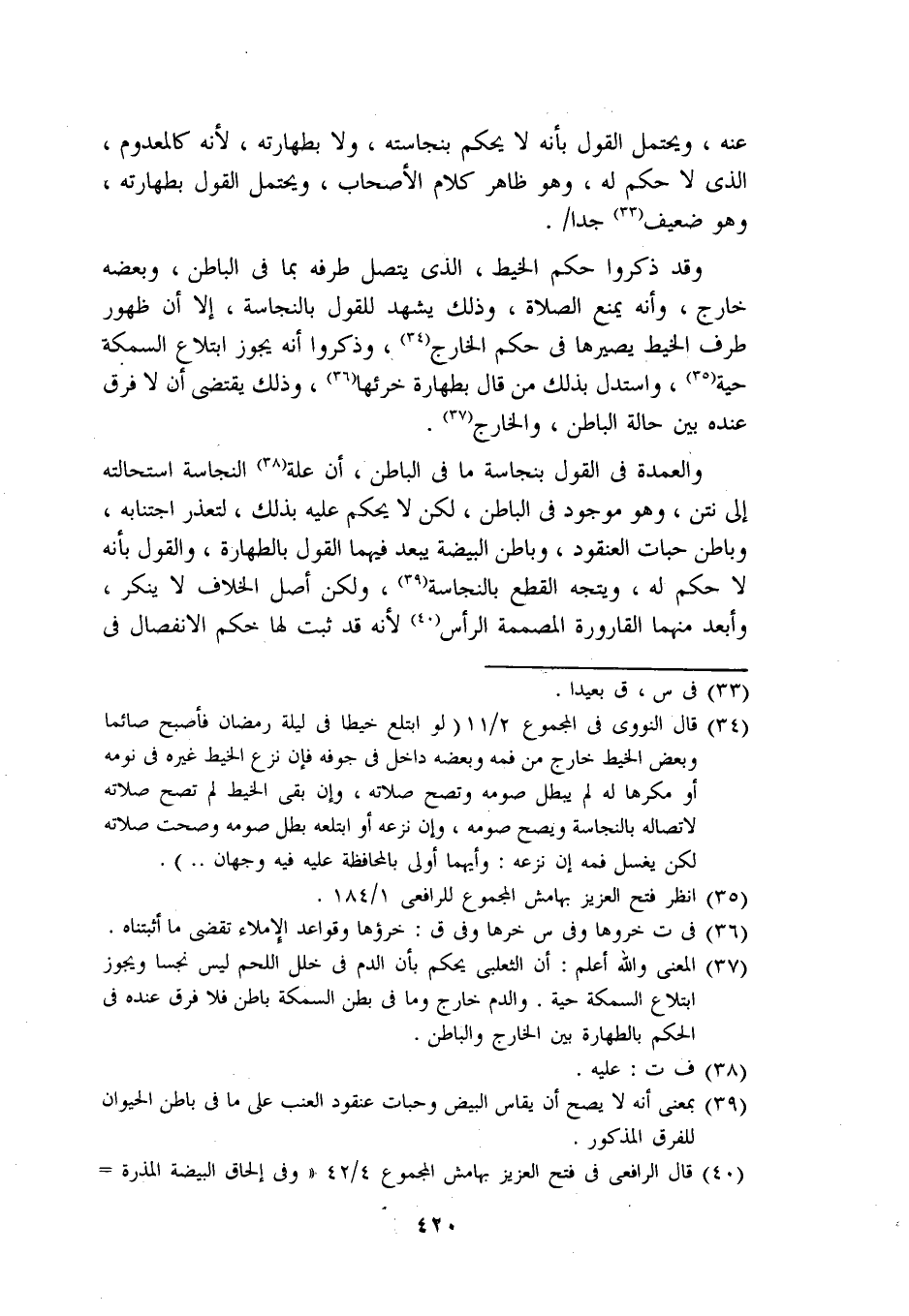 وقد ذكروا حكم الخيط، الذي يتصل طرفه بما في الباطن، وبعضه خارج، وأنه يمنع الصلاة، وذلك يشهد للقول بالنجاسة، إلا أن ظهور طرف الخيط يصيرها في حكم الخارج، وذكروا أنه يجوز ابتلاع السمكة حية، واستدل بذلك من قال بطهارة خرئها، وذلك يقتضي أن لا فرق عنده بين حالة الباطن، والخارج.