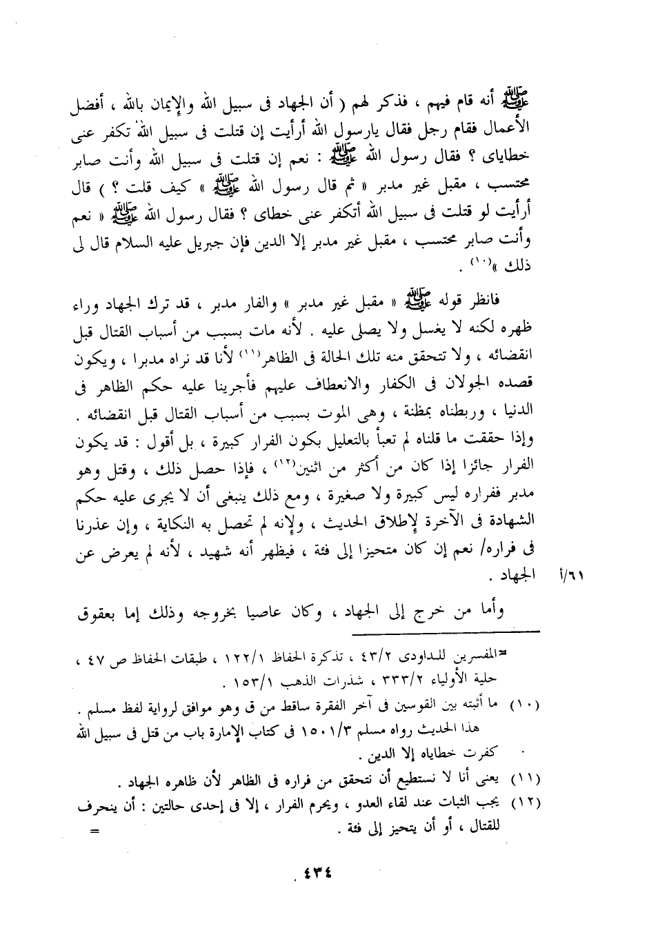 فانظر قوله صلى الله عليه وسلم "مقبل غير مدبر" والفار مدبر، قد ترك الجهاد وراء ظهره لكنه لا يغسل ولا يصلى عليه. لأنه مات بسبب من أسباب القتال قبل انقضائه، ولا تتحقق منه تلك الحالة في الظاهر لأنا قد نراه مدبرا، ويكون قصده الجولان في الكفار والانعطاف عليهم فأجرينا عليه حكم الظاهر في الدنيا، وربطنا بمظنة، وهي الموت بسبب من أسباب القتال قبل انقضائه. وإذا حققت ما قلناه لم تعبأ بالتعليل بكون الفرار كبيرة، بل أقول: قد يكون الفرار جائزا إذا كان من أكثر من اثنين، فإذا حصل ذلك، وقتل وهو مدبر فقراره ليس كبيرة ولا صغيرة، ومع ذلك ينبغي أن لا يجري عليه حكم الشهادة في الآخرة لإطلاق الحديث، ولإنه لم تحصل به النكاية، وإن عذرنا في فراره/ نعم إن كان متحيزا إلى فئة، فيظهر أنه شهيد، لأنه لم يعرض عن الجهاد.