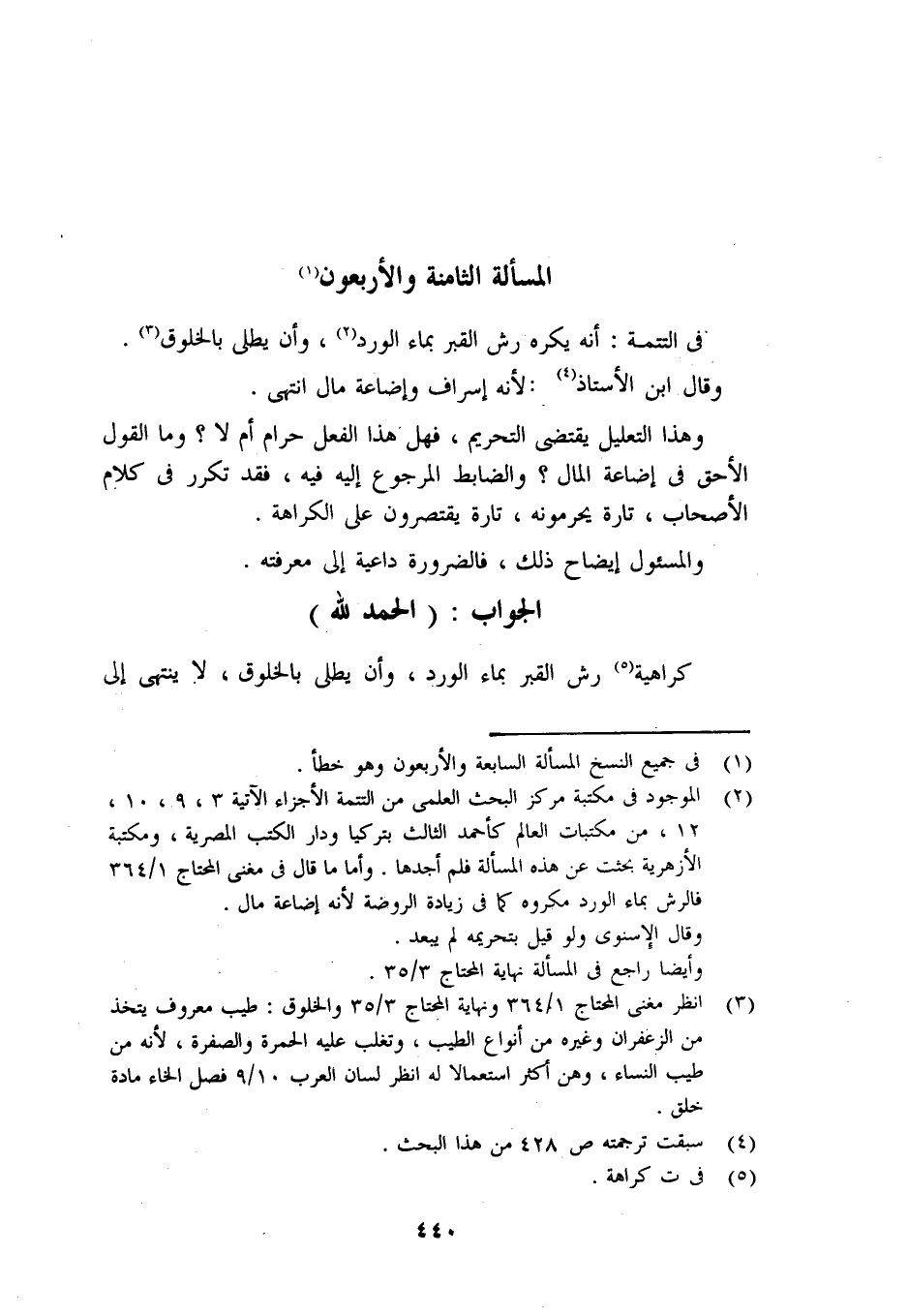كراهية رش القبر بماء الورد، وأن يطلى بالخلوق، لا ينتهي إلى