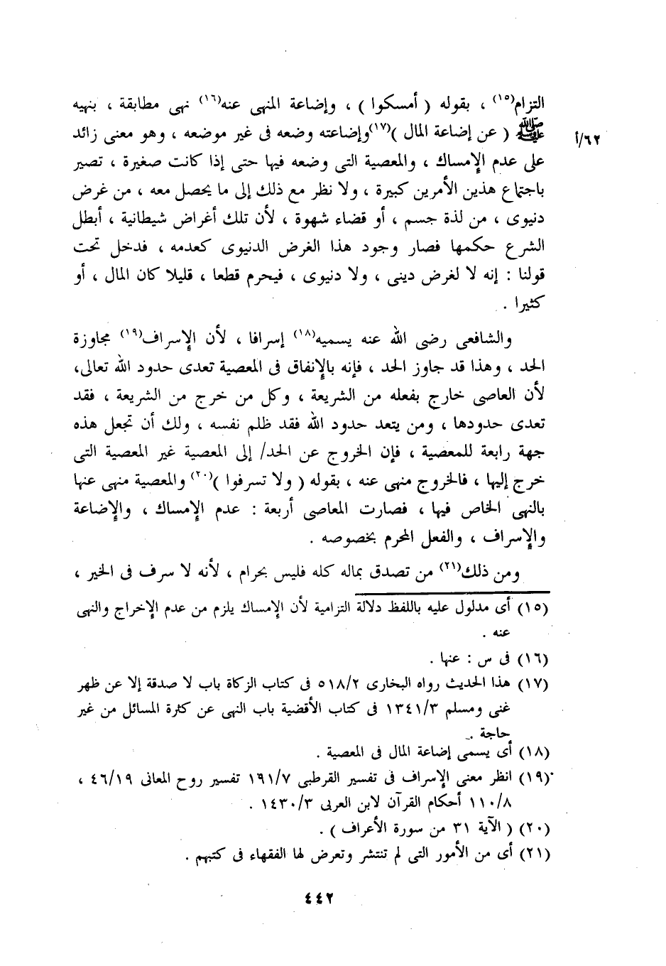 والشافعي رضي الله عنه يسميه إسرافا، لأن الإسراف مجاوزة الحد، وهذا قد جاوز الحد، فإنه بالإنفاق في المعصية تعدى حدود الله تعالى، لأن العاصي خارج بفعله من الشريعة، وكل من خرج من الشريعة، فقد تعدى حدودها، ومن يتعد حدود الله فقد ظلم نفسه، ولك أن تجعل هذه جهة رابعة للمعصية، فإن الخروج عن الحد/ إلى المعصية غير المعصية التي خرج إليها، فالخروج منهى عنه، بقوله (ولا تسرفوا) والمعصية منهى عنها بالنهي الخاص فيها، فصارت المعاصي أربعة: عدم الإمساك، والإضاعة والإسراف، والفعل المحرم بخصوصه.