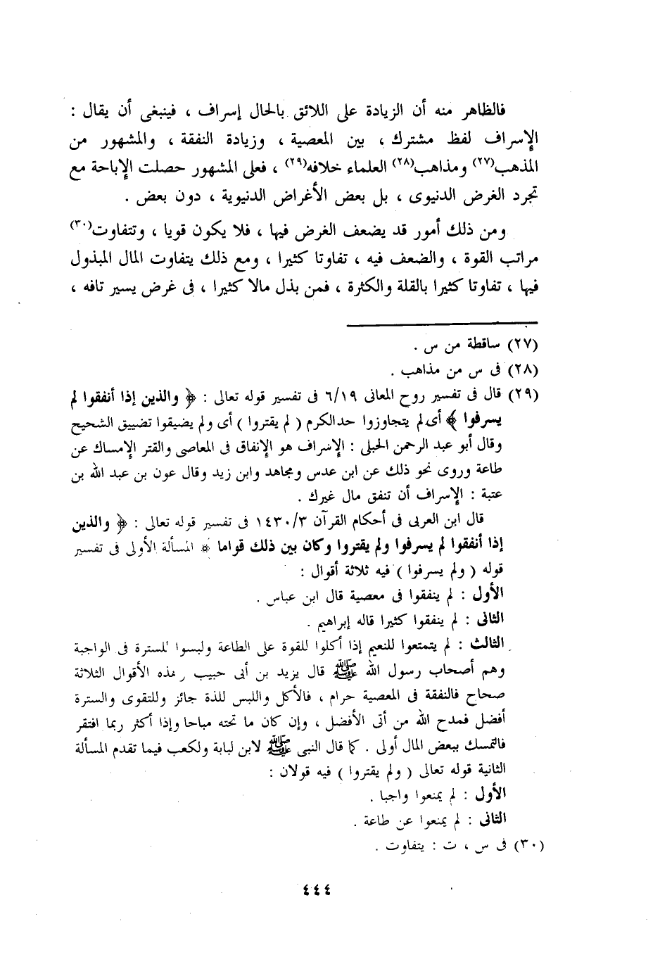 فالظاهر منه أن الزيادة على اللائق بالحال إسراف، فينبغي أن يقال: الإسراف لفظ مشترك، بين المعصية، وزيادة النفقة، والمشهور من المذهب ومذاهب العلماء خلافه، فعلى المشهور حصلت الإباحة مع تجرد الغرض الدنيوي، بل بعض الأغراض الدنيوية، دون بعض.