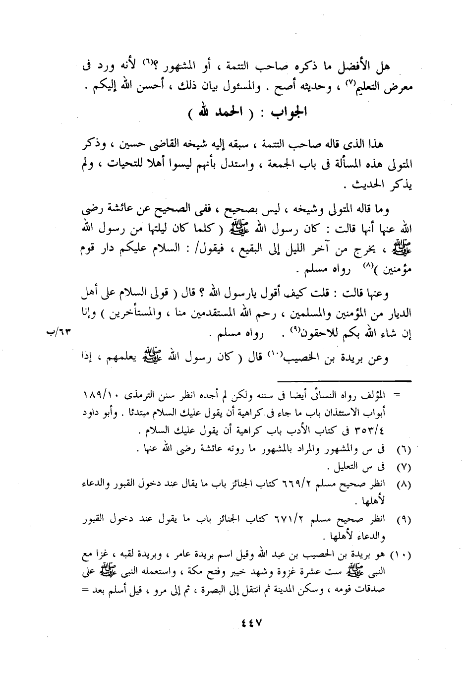 وما قاله المتولي وشيخه، ليس بصحيح، ففي الصحيح عن عائشة رضي الله عنها أنها قالت: كان رسول الله صلى الله عليه وسلم (كلما كان ليلتها من رسول الله صلى الله عليه وسلم، يخرج من آخر الليل إلى البقيع، فيقول/: السلام عليكم دار قوم مؤمنين) رواه مسلم.