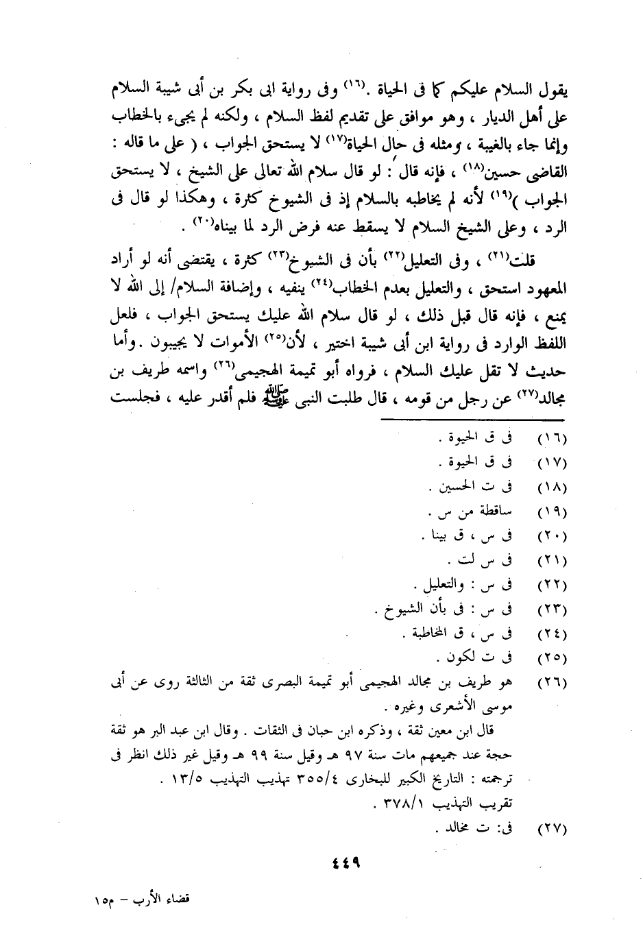 قلت، وفي التعليل بأن في الشيوخ كثرة، يقتضى أنه لو أراد المعهود استحق، والتعليل بعدم الخطاب ينفيه، وإضافة السلام/ إلى الله لا يمنع، فإنه قال قبل ذلك، لو قال سلام الله عليك يستحق الجواب، فلعل اللفظ الوارد في رواية ابن أبي شيبة اختير، لأن الأموات لا يجيبون. وأما حديث لا تقل عليك السلام، فرواه أبو تميمة الهجيمي واسمه طريف بن مجالد عن رجل من قومه، قال طلبت النبي صلى الله عليه وسلم فلم أقدر عليه، فجلست