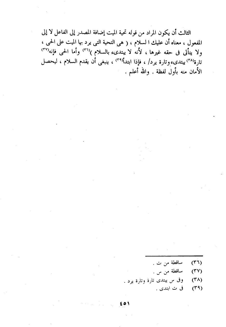 الثالث أن يكون المراد من قوله تحية الميت إضافة المصدر إلى الفاعل لا إلى المفعول، معناه أن عليك السلام، (هي التحية التي يرد بها الميت على الحي، ولا يتأتى في حقه غيرها، لأنه لا يبتدئ بالسلام) وأما الحي فإنه تارة يبتدئ وتارة يرد/، فإذا ابتدأ، ينبغي أني قدم السلام، ليحصل الأمانة منه بأول لفظه. والله أعلم.
