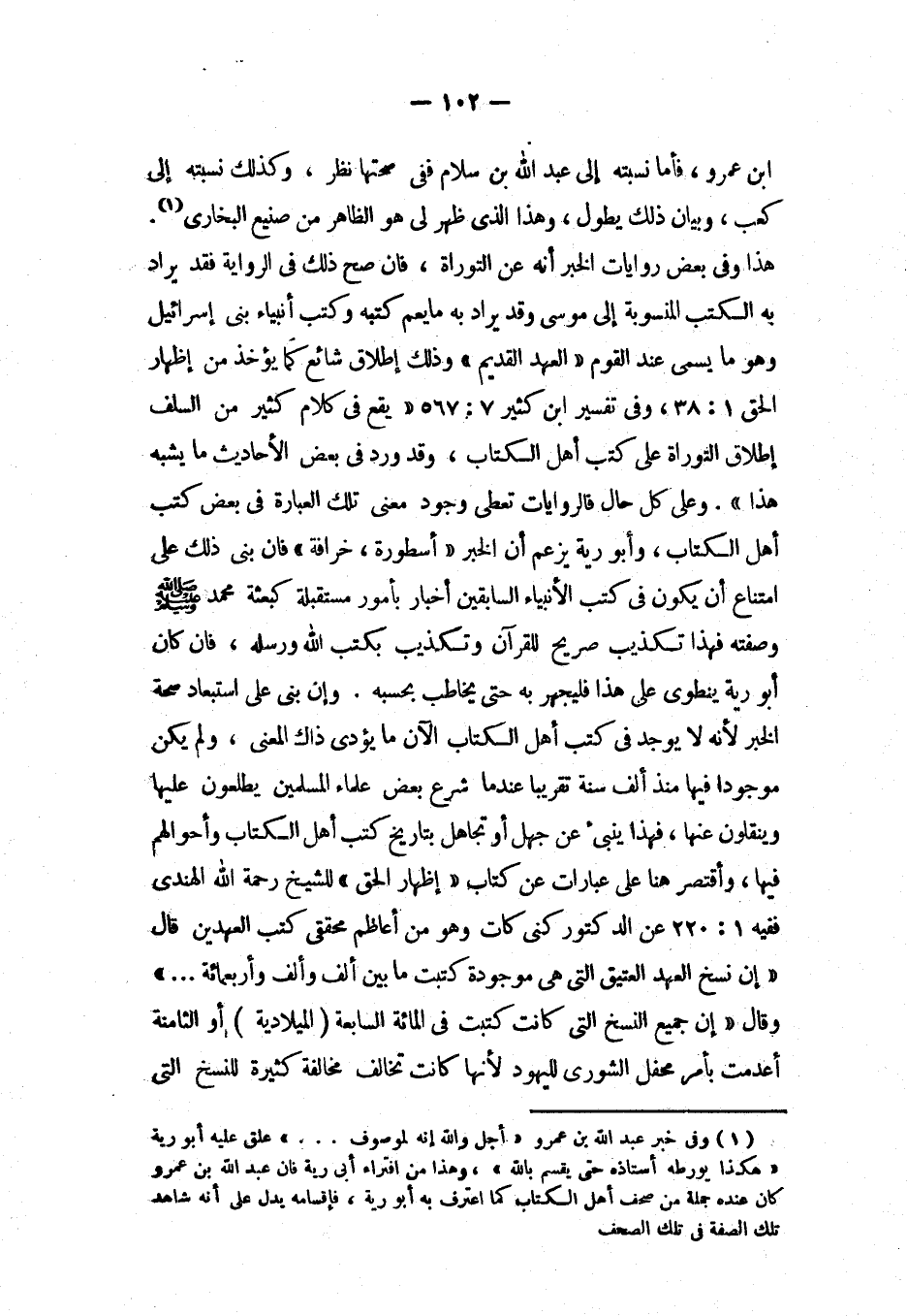 هذا وفي بعض روايات الخبر أنه من التوراة، فإن صح ذلك في الرواية فقد يراد به الكتب المنسوبة إلى موسى وقد يراد به ما يعم كتبه وكتب أنبياء بني إسرائيل وهو ما يسمى عند القوم «العهد القديم» وذلك إطلاق شائع كما يؤخذ من إظهار الحق 1: 38 وفي تفسير ابن كثير7:7 56يقع في كلام كثير من السلف إطلاق التوارة على كتب أهل الكتاب، وقد ورد في بعض الأحاديث ما يشبه هذا» . وعلى كل حال فالرويات تعطي وجود معنى تلك العبارة في بعض كتب أهل الكتاب، وأبو رية يزعم أن الخبر «أسطورة، خرافة» فإن بنى ذلك على امتناع أن يكون في كتب الأنبياء السابقين أخبار بأمور مستقبلة كبعثة محمد صلى الله عليه وسلم وصفته فهذا تكذيب صريح للقرآن وتكذيب بكتب الله ورسله، فإن كان أبو رية ينطوي على هذا فليجهر به حتى يخاطب بحسبه. وإن بنى على استبعاد صحة الخبر لأنه لا يوجد في كتب أهل الكتاب الآن ما يؤدي ذاك المعنى، ولم يكن موجوداً فيها منذ ألف سنة تقريباً عندما شرع بعض علماء المسلمين يطلعون عليها وينقلون عنها، فهذا يبنيء عن جهل أو تجاهل بتاريخ كتب أهل الكتاب وأحوالهم فيها، واقتصر هنا على عبارات عن كتاب «إظهار الحق» للشيخ رحمة الله الهندي ففيه 220:1 عن الدكتور كني كات وهو من أعظم محققي كتب العهدين قال «إن نسخ العهد العتيق التي هي موجودة كتبت ما بين ألف وألف وأربعمائة ... » وقال «إن جميع النسخ التي كانت كتبت في المائة السابعة (الميلادية) أو الثامنة أعدمت بأمر محفل الشورى لليهود لأنها كانت تخالف مخالفة كثيرة للنسخ التي