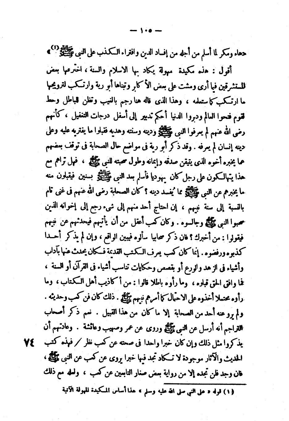 أقول: هذه مكيدة مهولة يكاد بها الإسلام والنسة، اخترعها بعض المستشرقين فيما أرى ومشت على بعض الأكابر وتبناها أبو رية وارتكب لترويجها ما ارتكب كما ستعلمه، وهذا الذي قاله هنا رجم بالغيب وتظن للباطل وحط لقوم فتحوا العالم ودبروا الدنيا أحكم تدبير إلى أسفل درجات التغفيل، كأنهم رضي الله عنهم لم يعرفوا النبي صلى الله عليه وسلم ودينه وسنته وهديه فقبلوا ما يفتريه عليه وعلى دينه إنسان لم يعرفه، وقد ذكر أبو رية في مواضع حال الصحابة في توقف بعضهم عما يخبره أخوه الذي يتيقن صدقه وإيمانه وطول صحبته للنبي صلى الله عليه وسلم، فهل تراهم مع هذا يتهالكون على رجل كان يهودياً فأسلم بعد النبي صلى الله عليه وسلم بسنين فيقبلون منه ما يخبرهم عن النبي صلى الله عليه وسلم مما يفسد دينه؟ كان الصحابة رضي الله عنهم في غنى تام بالنسبة إلى سنة نبيهم، إن احتاج أحد منهم إلى شيء رجع إلى إخوانه الذين صحبوا النبي صلى الله عليه وسلم وجالسوه، وكان كعب أعقل من أن يأتيهم فيحدثهم عن نبيهم فيقولوا: من أخبرك؟ فإن ذكر صحابياً سألوه فيبين الواقع، وإن لم يذكر أحدا كذبوه ورفضوه، إنما كان كعب يعرف الكتب القديمة فكان يحدث عنها بآداب وأشياء في الزهد والورع أو بقصص وحكايات تناسب أشياء في القرآن أو السنة، فما وافق الحق قبلوه، وما رأوا باطلاً قالوا: من أكاذيب أهل الكتاب، وما رأوه محتملاً أخذوه على الاحتمال كما أمرهم نبيهم صلى الله عليه وسلم ذلك كان فن كعب وحديثه. ولم يرو عنه أحد من الصحابة إلا ما كان من هذا القبيل. نعم ذكر أصحاب التراجم أنه سئل عن النبي صلى الله عليه وسلم وروى عن عمر وصهيب وعائشة. وعادتهم أن يذكروا مثل ذلك وإن كان خبراً واحداً في صحته عن كعب نظر / فهذه كتب الحديث والآثار موجودة لا تكاد تجد فيها خبراً يروى عن كعب عن النبي صلى الله عليه وسلم فإن وجد فلن تجده إلا من رواية بعض التابعين عن كعب، ولعله مع ذلك