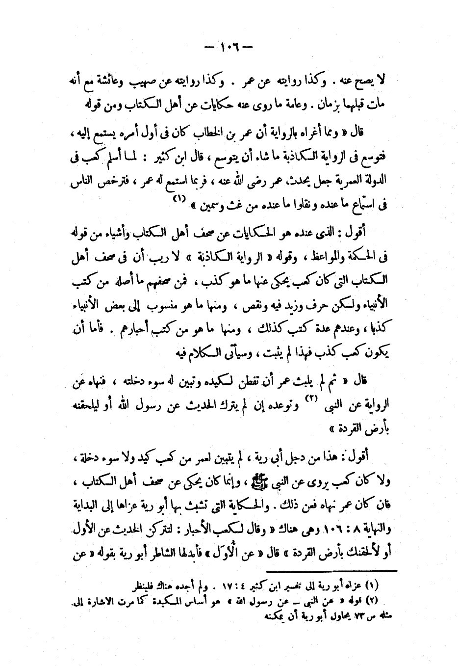 أقول: هذا من دجل أبي رية، لم يتبين لعمر من كعب كيد ولا سوء دخلة، ولا كان كعب يروي عن النبي صلى الله عليه وسلم، ,إنما كان يحكي عن صحف أهل الكتاب، فإن كان عمر نهاه فعن ذلك. والحكاية التي تشبث بها أبو رية عزاها إلى البداية والنهاية 106:8 وهي هناك «وقال لكعب الأحبار: لتتركن الحديث عن الأول أو لألحقنك بأرض القردة» قال «عن الأول» فأبدلها الشاطر أبو رية بقوله «عن