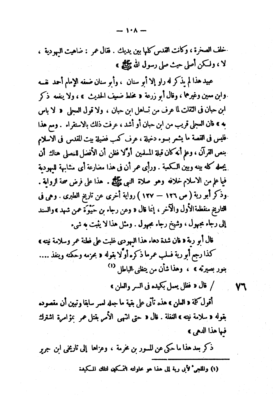 عبيد هذا لم يذكر له راو إلا أبو سنان، وأبو سنان ضعفه الإمام أحمد نفسه وابن معين وغيرهما، وقال أبو زرعة «مخلط ضعيف الحديث» ، ولا ينفعه ذكر ابن حبان في الثقات لما عرف من تساهل ابن حبان، ولا قول العجلي «لا بأس به» فإن العجلي قريب من ابن حبان أو أشد، عرفت ذلك بالاستقرار. ومع هذا فليس في القصة ما يشعر بسوء دخيله، عرف كعب فضيلة بيت المقدس في الإسلام بنص القرآن، وعلم أنه كان قبلة المسلمين أولاً فظن أنه الأفضل للمصلى هناك أن يجعله كله بينه وبين الكعبة، ورأى عمر أن في هذا مضارعة أي مشابهة لليهودية، فيما علم من الإسلام خلافه، وهو صلاة النبي صلى الله عليه وسلم. هذا على فرض صحة الرواية. وذكر أبو رية (ص126-127) رواية أخرى عن تاريخ الطبري. وهي في التاريخ منقطعة الأول والآخر، إنما قال «وعن رجاء بن حيوة عمن شهد» والسند إلى رجاء مجهول، وشيخ رجاء مجهول، ومثل هذا لا يثبت به شيء