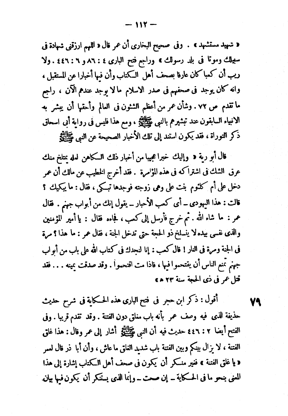 «شهيد مستشهد» . وفي صحيح البخاري أن عمر قال «اللهم ارزقني شهادة في سبيلك وموتاً في بلد رسولك» وراجع فتح الباري 86:4 و 446:6 ولا ريب أن كعبا كان عارفاً بصحف أهل الكتاب وأن فيها أخباراً عن المستقبل، وأنه كان يوجد في صحفهم في عهد الإسلام ما لا يوجد عندهم الآن، راجع ما تقدم ص72. وشأن عمر من أعظم الشئون في العالم وأحقها أن يبشر به الأنبياء السابقون عند تبشيرهم بالنبي صلى الله عليه وسلم، ومع هذا فليس في رواية أبي إسحاق ذكر التوراة، فقد يكون استند إلى تلك الأخبار الصحيحة عن النبي صلى الله عليه وسلم