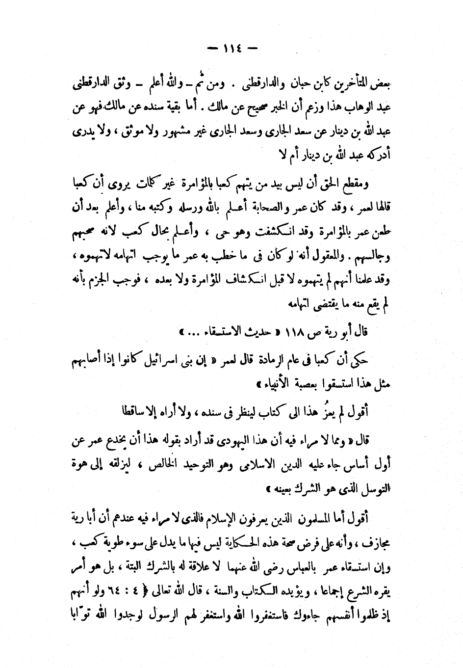 أقول: أما المسلمون الذي يعرفون الإسلام فالذي لا مراء فيه عندهم أن أبا رية مجازف، وأنه على فرض صحة هذه الحكاية ليس فيها ما يدل على سوء طوية كعب، وإن استسقاء عمر بالعباس رضي الله عنهما لا علاقة بالشرك البتة، بل هو أمر يقره الشرع إجماعاً، ويؤيده الكتاب والسنة، قال الله تعالى (64:4 ولو أنهم إذ ظلموا أنفسهم جاؤك فاستغفروا الله واستغفر لهم الرسول لوجدوا الله تواباً