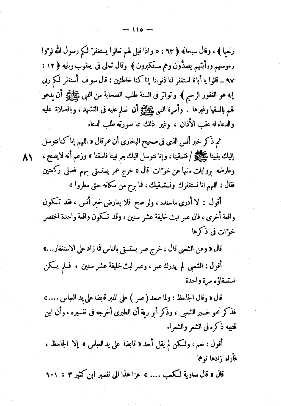 ثم ذكر خبر أنس الذي في صحيح البخاري أن عمر قال «اللهم إنا كنا نتوسل إليك بنبينا صلى الله عليه وسلم / فتسقينا، وإنا نتوسل إليك بعم نبينا فاسقنا» وزعم أنه لا يصح، وعارضه بروايات منها عن خوات قال «خرج عمر يستسقي بهم فصلى ركعتين فقال: اللهم إنا نستغفرك ونستسقيك، فما برح من مكا نه حتى مطروا»