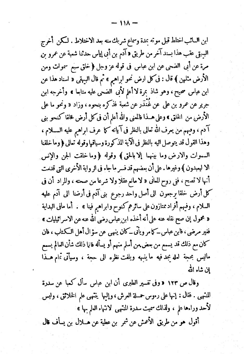 وقال ص123 «وفي تفسير الطبري أن ابن عباس سأل كعباً عن سدرة المنتهى. فقال: إنها على رءوس حملة العرش، وإليها ينتهي علم الخلائق، وليس لأحد وراءها علم، ولذلك سميت سدرة المنتهى لانتهاء العلم بها»