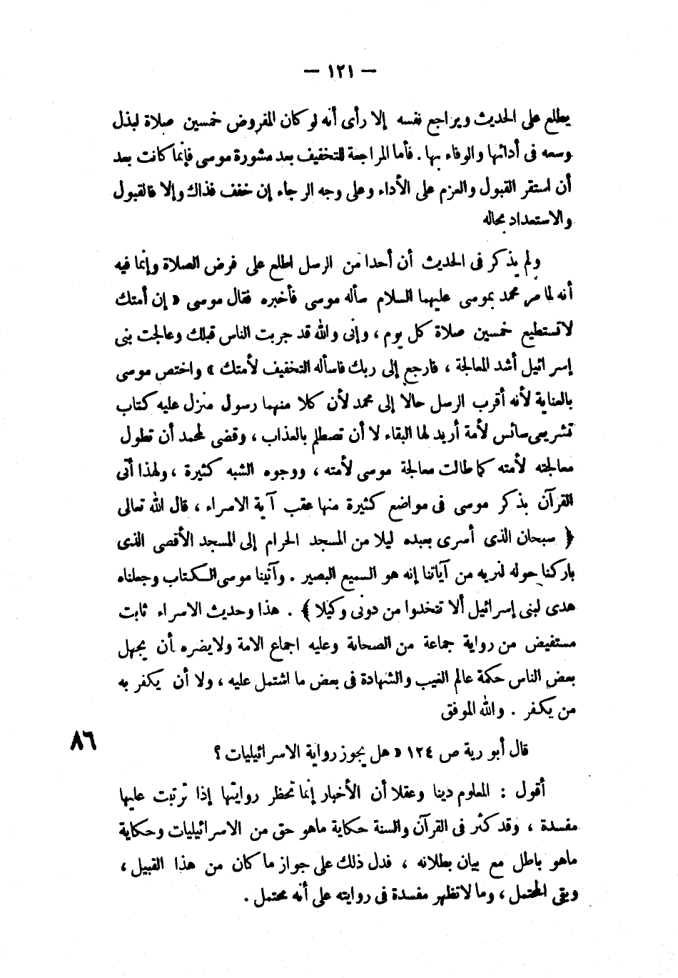 ولم يذكر في الحديث أن أحداً من الرسل اطلع على فرض الصلاة وإنمافيه أنه لما مر بموسى عليهما السلام سأله موسى فأخبره فقال موسى «إن أمتك لا تستيطع خمسين صلاة كل يوم، وإني والله قد جربت الناس قبلك وعالجت بني إسرائيل أشد المعالجة، فارجع إلى ربك فاسأله التخفيف لأمتك» واختص موسى بالعناية لأنه أقرب الرسل حالاً إلى محمد لأن كلاًً منها رسول منزل عليه كتاب تشريعي سائس لأمة أريد لها البقاء لا أن تصطلم بالعذاب، وقضى لمحمد أن تطول معالجته لأمته كما طالت معالجة موسى لأمته، ووجوه الشبة كثيرة، ولهذا أتى القرآن بذكر موسى في مواضع كثيرة منها عقب آية الإسراء، قال الله تعالى (سبحان الذي أسرى بعبده ليلاً من المسجد الحرام إلى المسجد الأقصى الذي باركنا حوله لنريه من آياتنا إنه هو السميع البصير. وآتينا موسى الكتاب وجعلناه هدى لبني إسرائيل ألا تتخذوا من دوني وكيلا) هذا وحديث الاسراء ثابت مستفيض عن رواية جماعة من الصحابة وعليه إجماع الأمة ولايضره أن يجهل بعض الناس حكمة عالم الغيب والشهادة في بعض مااشتمل عليه، ولا أن يكفر به من يكفر. والله الموفق