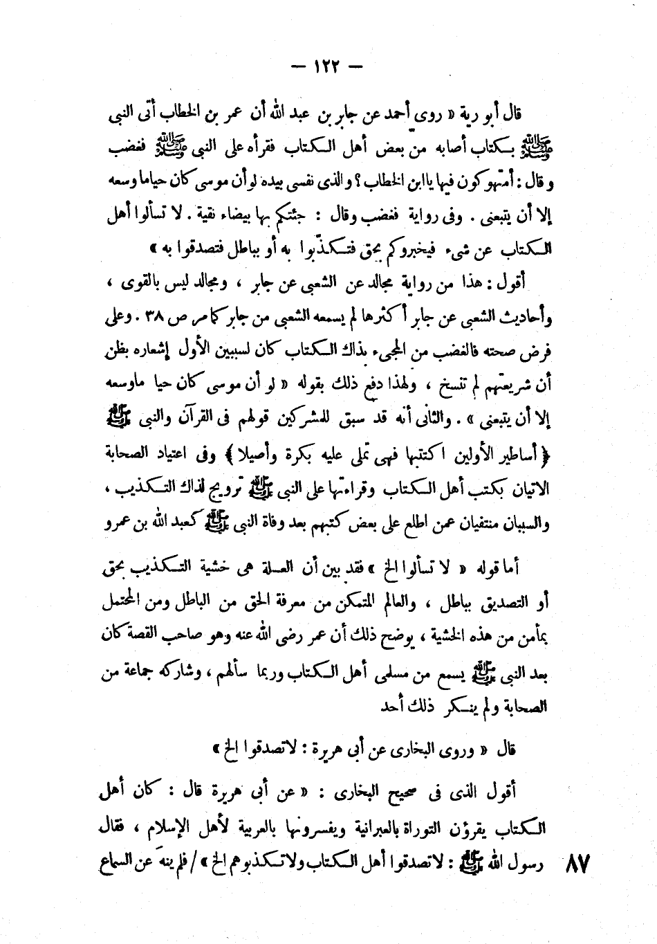 أما قوله «لا تسألوا الخ» فقد بين أن العلة هي خشية الكذب بحق أو التصديق باطل، والعالم المتكن من معرفة الحق من الباطل ومن المحتمل بمأمن من هذه الخشية، يوضخ ذلك أن عمر رضي الله عنه وهو صاحب القصة كان بعد النبي صلى الله عليه وسلم يسمع من مسلمي أهل الكتاب وربما سألهم، وشاركه جماعة من الصحابة ولم ينكر ذلك أحد
