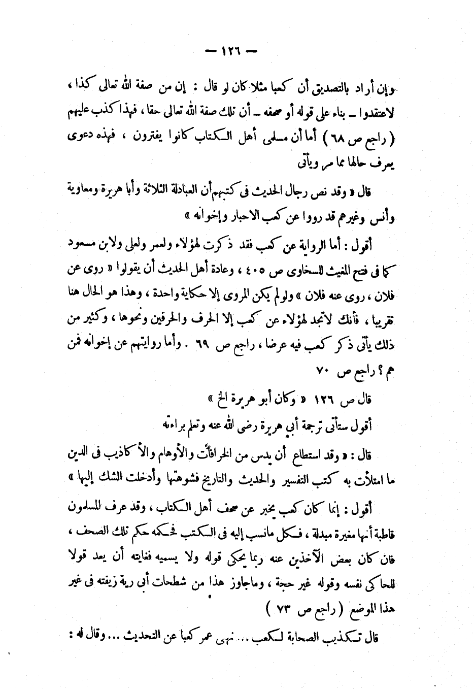 قال «وقد نص رجال الحديث في كتبهم أن العبادلة الثلاثة وأبا هريرة ومعاوية وأنس وغيرهم قد رووا عن كعب الأحبار وإخوانه»